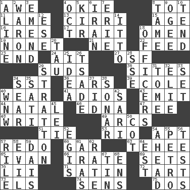 ACROSS 1. Deep reverence 4. Migrant worker of the '30s 8. Small child 11. Unable to walk 13. High-altitude cloud 15. Grow older 16. Angers 17. Distinguishing feature 18. Sign of something about to happen 19. Music written for nine 21. Fish or hair follower 22. Nourish 23. Conclusion 24. Small island 27. Order of Saint Francis (abbr.) 29. Beer foam 30. Locates 34. Fast jet (abbr.) 36. Hearing organs 39. Learning spot: Fr. 40. Put on (as clothing) 41. Goodbye (Sp.) 43. Give off 44. Relating to or accompanying birth 46. Pulitzer Prize-winning author Ferber 47. To sift 48. Compose 49. Curves 51. Make a knot 53. _ de Janeiro 54. Fitting 57. Redecorate 60. Slender fish 63. Giggle 65. "Terrible" tsar 66. Feeling or showing extreme anger 69. Arranges properly for use 70. Cards in a Roman deck? 71. Smooth fabric 72. Small pie 73. Raised railways 74. Elected reps. 75. Two (Sp.) DOWN 1. Place in a line 2. Make _____ (do battle with) 3. Make improvements or corrections to 4. Sep. follower 5. Apertif with cassis 6. SW Asia republic 7. One of the Great Lakes 8. Docile 9. Double curve, resembling the letter S 10. Look after 12. Compass dir. 14. "Tell ____ the Marines!" 18. Persons of authority 20. The 19th letter of the Greek alphabet 25. It may be bright or harebrained 26. Sadhe (variant) 28. Compass dir. 29. Ski resort town in Vermont 31. Heavy book 32. Writer Wiesel 33. Put into a specified state 34. Scorch 35. Suttee (variant) 37. To free from 38. Echolocation 40. Compass dir. 42. Indian skirt 45. Luau accessory 50. Small bed 52. The front part of a cuirass 54. At or in the front 55. Stone: prefix 56. Trials 57. Cause heat under the collar 58. Morally bad or wrong 59. Raised platform 61. Ancient river in northeast Turkey 62. Assign a rank or rating to 64. Eastern Standard Time (abbr.) 67. Metal container 68. Followers of ems