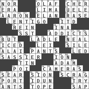 ACROSS 1. And not 4. Norwegian king 8. "Mermaids" star 12. Epoch 13. Pale green bean 14. Ubangi River tributary 15. Composer Copland 18. Style 19. Raze (variant) 20. Small, flat, pigmented spot on the skin 22. It would 23. It's straight from the horse's mouth 24. _ tizzy (2 wds.) 25. Fast jet (abbr.) 26. Inveterate users 30. Yet 33. Dipping utensil 36. Actress Patricia 37. On the rocks 39. Luau accessory 40. Drop; flow; fall 41. Mountain range southwest of Kyrgyzstan 42. Leg coverings 44. Directed 45. More disrespectful 47. Electrically charged atom 50. Metal container 51. First man 53. Luau course 54. Devices for capturing images 57. Dry up 59. The Jewish people; Israel 61. Strangle with an iron collar 63. Left side of a ship or aircraft 64. Goddess of spring and wife of Bragi 65. Attempt 66. Pismires 67. Drink excessively 68. Plant excrement DOWN 1. Teachers' org. 2. Relating to the mouth 3. Less widely known 4. Cassini of fashion 5. _ and Stitch 6. Wet nurse (var.) 7. Air blower 8. Window treatments 9. Froth on beer 10. Raised railways 11. To riddle 16. Washington bills 17. Nuclear Threat Initiatives 21. International (abbr.) 22. Working for oneself (abbr.) 24. Binary compound 26. Came down and settled, as after flight 27. To provide with a ceiling 28. Story 29. Downhill vehicle 30. Prejudice 31. Southern CA. univ. 32. Beverages made from leaves 34. Having or resembling wings 35. Lair 38. What propaganda does 42. Fenced enclosure 43. Thailand, formerly 46. One more than two 48. Lyric poems 49. Drug cop 52. Shops 53. Piece 54. Overturn; upset 55. Singer Murray 56. "Two Mules for Sister ____" 57. Health resort 58. Period of immesurable duration 59. Be seated 60. Wedding promise 62. Con