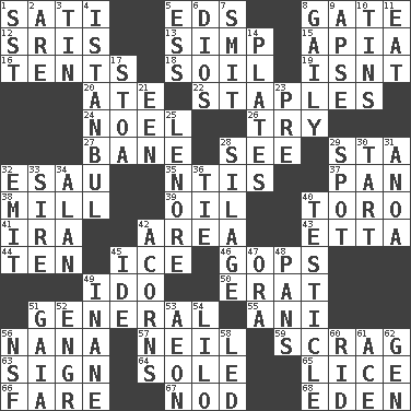 ACROSS 1. Suttee (variant) 5. Begley and Asner 8. Yard entry 12. Indian titles of respect 13. Simple or foolish person 15. Capital of Western Samoa 16. Portable shelters 18. Land 19. Is not 20. Had dinner 22. Paper fasteners 24. Christmas carol 26. Attempt to accomplish something 27. Object of repulsion 28. Perceive with the eye 29. R.R. building 32. He sold his birthright 35. Nuclear Threat Initiatives 37. Baking dish 38. Place where flour is made 39. Petroleum 40. "Corrida" creature 41. Retirement account (abbr.) 42. Length times width 43. Singer James 44. "___ Little Indians" 45. Frozen water 46. Republicans 49. Wedding promise 50. Part of Q.E.F. 51. Commissioned military rank 55. Cuckoo 56. Grandmother 57. Famous astronaut Armstrong 59. Strangle with an iron collar 63. Public display of a written message 64. Flatfish 65. Louse (plural) 66. Conductor's collection 67. Lower and raise head in agreement 68. Locale of original sin DOWN 1. Fast jet (abbr.) 2. "We ___ not amused" (Victoria) 3. Shallow baking pan 4. Byzantium, centuries later 5. Curvy letter 6. "Vaya con ____" 7. Stricken, poetically 8. Lightheartedly 9. Domed church section 10. Metal containers 11. Ingest 14. Food holders 17. Portico 21. Car or cant ending 23. Before (prefix) 25. Poe poem 28. Fodder prepared in a silo 29. Specific locale 30. Small pie 31. Small Philippine buffalo 32. Give off 33. The founder of a family 34. ____ Jay Lerner 36. Standoff 40. A testis 42. Oak nuts 45. Binary compound 47. Mouth or opening 48. Zero-star reviews 49. Silly 51. Greek goddess of the earth (variant) 52. Engineer (abbr.) 53. Period of immesurable duration 54. _ and Stitch 56. Science/research agcy. 58. Directed 60. To free from 61. Adept person 62. Commissioned military rank (abbr.)