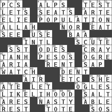ACROSS 1. Personal Computers (abbr.) 4. High mountains 8. Trial 12. Allows 14. Theater features 16. Johnson of "Laugh-In" 17. Writer Wiesel 18. Census information 20. Assad's deity 22. And not 23. Ingest 24. Perceive with the eye 25. Purpose 28. Sound made by sheep 30. International (abbr.) 31. Turtle shell scale 35. Fast jet (abbr.) 37. Lyric poems 40. Supercomputer manufacturer 41. Hyperbolic tangent 42. Mexican monetary units 44. Legendary monster 45. Operatic vocal solo 46. Monthly bill 47. Plant excrement 48. Observe 50. Incision 52. Atmosphere 54. And so on (abbr.) 55. A female animal or person 58. Had dinner 61. Allow 63. Stares at amorously 65. Probability 70. Table seasoning 71. Ancient Greek god of war 72. Thoroughly unpleasant 73. Competent 74. State of inaction 75. Carryall 76. Mayday DOWN 1. Entreaties 2. Cell (Danish) 3. Vertical member of a panel or frame 4. Cleo's killer 5. Lion 6. Infant food 7. Astound 8. Make lace 9. 4th largest of the Great Lakes 10. Portico 11. Portable shelter 13. Ocean 15. Messy guy 19. Ancient river in northeast Turkey 21. Attila the _ 26. Constrict 27. A person who is older than you are 29. Buttonhole 30. New York city 32. Capital and largest city of Mongolia 33. Canvas cover 34. Sight organ 35. "Two Mules for Sister ____" 36. In a ____ (agitated or irritated) 38. Compass dir. 39. Something which is sent 41. The 23rd letter of the Hebrew alphabet 43. Proofreading order 49. Land elevation 51. Non-commissioned officer (abbr.) 53. It's straight from the horse's mouth 55. Thick slices 56. Phone greeting 57. _____ Park, CO 58. Having or resembling wings 59. Become fatigued 60. Supplements with great effort 62. Not this but _ 64. Girls' org. (abbr.) 66. Eastern Standard Time (abbr.) 67. Bear (Spanish) 68. Baseball player Mel 69. Color