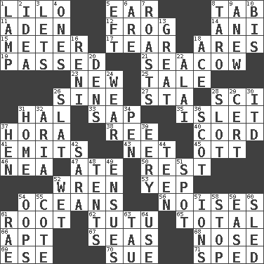 ACROSS 1. _ and Stitch 5. Hearing organ 8. Bar bill 11. An important port of Yemen 12. Tree-dwelling hopper 14. Cuckoo 15. Distance measurement 17. Separate forcefully 18. Ancient Greek god of war 19. Went by 21. Manatee 23. ___ Haven, CT 25. Lie 26. Trig term 27. R.R. building 28. _-fi 31. Actor Linden 33. Plant excrement 35. Small island 37. Israeli folk dance 38. To separate or throw off 40. Drawstring 41. Sends forth 43. Fish or hair follower 45. Baseball player Mel 46. Teachers' org. 47. Had dinner 50. Relief 52. Songbird 53. Slangy assent 54. Seas 56. Annoying sounds 61. Carrot, for example 62. Ballerina skirt 65. "_____ Recall" 66. Fitting 67. Oceans 68. Characteristic smell of wine 69. Compass dir. 70. Institute legal proceedings 71. Broke a traffic law DOWN 1. Desk light 2. The main thing one is thinking about 3. Allows 4. Singles 5. Newt 6. "We ___ not amused" (Victoria) 7. Cooks with dry heat, as in an oven 8. Pacific island yam 9. Afresh 10. Altar cloth linen 13. Relatively large 16. Painter Guido (1575-1642) 18. Adept person 20. Lairs 22. Mountain range southwest of Kyrgyzstan 24. Erode 26. Narrow board 28. Groove 29. Certainty 30. It would 31. Residence 32. Operatic vocal solo 34. Animal enclosure 36. Highlander 37. Layer 39. Suggestive of the supernatural 42. "Two Mules for Sister ____" 44. Adolescent 48. Portable shelters 49. Follows as a consequence or result 51. Specific locale 52. Dripping 54. I made a mistake 55. ____ d'Azur (French Riviera) 57. Charged atoms 58. Constrict 59. Comfort 60. Downhill vehicle 61. Actress Charlotte 63. The 19th letter of the Greek alphabet 64. Purpose