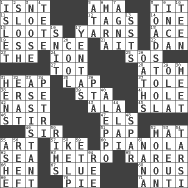 ACROSS 1. Is not 5. Wet nurse (var.) 8. Teat (slang) 11. _ gin 12. Labels 14. Single 15. Plunders 17. Tall tales 18. Adept person 19. Gist 21. Small island 22. Daniel's nick name 23. Definite Article 24. Electrically charged atom 25. Mayday 27. Small child 28. Smallest unit of an element 31. Pile 35. Infant locale 37. Lacquered or enameled metalware 38. Celtic language 39. R.R. building 41. Hollow 42. Political cartoonist Thomas 43. Wing 45. Narrow board 46. Tumult 47. Raised railways 49. Title for a knight 51. Infant food 52. Floor covering 55. Nonscientific branch of learning 57. D.D.E's nickname 60. Player piano 62. Ocean 63. Paris' subway 65. Less widely known 66. Layer 67. Turn sharply 68. Good sense 69. Lizard (obsolete) 70. Sliced dessert 71. Against DOWN 1. Small island 2. Agitate, as a liquid 3. Trap for birds or small mammals 4. False hair 5. _ moment's notice (2 wds.) 6. Hindu Mythology: god of death 7. Hindu god of fire 8. Inedible or poisonous agaric 9. South American Indian 10. Adolescent 13. Fast planes 16. In a ____ (agitated or irritated) 17. Gossips 20. Calm and collected 26. Expletives 29. Spanish pot 30. Rendezvous 31. Coop moms 32. Part of Q.E.F. 33. Helper 34. _ dish (used to culture cells) 36. Parent Teacher Association (abbr.) 40. City in Syria 44. Mountain range southwest of Kyrgyzstan 48. Coast Guard woman 50. Basketball hoops 52. Person of subnormal intelligence 53. Native American of Southwest Alaska 54. Tarsus (plural) 55. American tennis player Robert 56. Coral collection 58. Seaweed 59. Needle holder 61. Nanny 64. To riddle