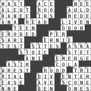 ACROSS 1. Vertical spar for supporting sails 5. Adept person 8. Born 11. Eskimo relative 13. Friend of Pooh 14. Old (Scot.) 15. The wife of a rajah (variant) 16. Big collection agency 17. Ancient Persian 18. Santa ___, CA 19. Froth on beer 21. Make or become more lively 22. Adolescent 24. Aroma 25. Worn away 27. For each 29. Indian skirt 30. Bert's buddy 32. Trial 33. Locates 35. "____ silly question..." 39. Unemotional 41. Proofreading order 42. Black tropical American cuckoo 43. Develop 45. SW Saudi Arabia district 48. Root beer relative 49. Obtain by seizing forcibly or violently 50. Parka part 52. Three (prefix) 55. Monetary unit of Yemen 56. HTML Container Element 57. Keyboard key 59. Relaxation 60. "___ Maria" 61. Biscuitlike quick bread 62. Compass dir. 63. Benjamin's nick name 64. Washington bills DOWN 1. Hindu Mythology: god of death 2. Actor Alda or Thicke 3. Elected representatives 4. Third day of the wk. 5. Roberta Peters solo 6. Drawstring 7. Greek goddess of the dawn 8. New (sp.) 9. A person who is older than you are 10. Genesis locale 12. Giggle 14. Among 20. Conclude 21. Australian parrot (variant) 23. Prepares for publication 25. Eastern Standard Time (abbr.) 26. Actress Charlotte 27. Before (prefix) 28. Followers of ems 30. And so on (abbr.) 31. Artist's stand 33. Boy, to dad 34. One more than two 36. Ski resort town in Vermont 37. Barrel 38. Had dinner 40. Small pie 43. Environmental prefix 44. Methods 45. Believer in; advocate of (suffix) 46. Gospel singer Marvin 47. Small island 49. Songbird 50. Hub of activity 51. Baking chamber 53. French philosopher Descartes 54. Angers 56. Pat or tap gently 58. Non-commissioned officer (abbr.)
