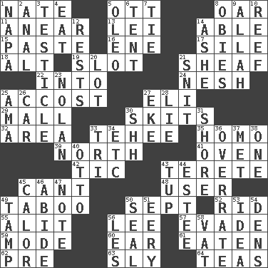 ACROSS 1. Nathan's nickname 5. Baseball player Mel 8. Rowing implement 11. Approach 13. Flowery wreath 14. Competent 15. Thick mixture 16. Compass dir. 17. Drop; flow; fall 18. Keyboard modifier key 19. Groove 21. Bundle of cut stalks of grain 22. To the inside or interior of 24. Soft 25. Buttonhole 27. Biblical high priest 29. Promenade 30. Burlesque acts 32. Type of rug 33. Giggle 35. Like (prefix) 39. _ pole 41. Baking chamber 42. Nervous spasm 43. Cylindrical with tapered ends 45. Patter 48. One who makes use of a thing 49. Off limits 50. Back-to-school mo. 52. To free from 55. Came down and settled, as after flight 56. Area sheltered from the wind 57. Dodge 59. Method 60. Ewer handle 61. Eroded 62. Before (prefix) 63. Stealthy 64. Afternoon social gatherings DOWN 1. California wine valley 2. Of or related to the anus 3. One of the two male reproductive glands 4. Ingest 5. Butter sub 6. Portable shelter 7. Make a knot 8. Off-Broadway awards 9. Assad's deity 10. Coral ridge 12. Musical pauses 14. American tennis player Robert 20. Car dealer's back yard 21. In a ____ (agitated or irritated) 23. Pitcher Ryan 25. Wet nurse (var.) 26. Auto 27. Supplement with great effort 28. Falsehood 30. Quiet! 31. Dinah or Pauly 33. Three (prefix) 34. And so on (abbr.) 36. Make much ado about nothing 37. Was introduced to 38. Single 40. Von Bismarck 43. Uncastrated adult male sheep 44. First name in cosmetics 45. Bodily heat indicating an inflammation 46. Tolerate 47. Musical sound 49. Pack (down) 50. Lick closed 51. Suggestive of the supernatural 53. The main thing one is thinking about 54. Habitations of wild animals 56. French article 58. Large container