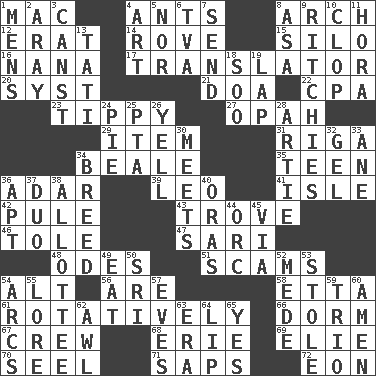 ACROSS 1. Big _ 4. Pismires 8. Bowlike part 12. Part of Q.E.F. 14. Be footloose 15. Grain storage tower 16. Grandmother 17. Interpreter 20. System (abbr.) 21. ___ good deed 22. Numbers guy (abbr.) 23. Likely to tip or tilt 27. Brightly colored fish 29. A whole individual unit 31. Port city in Latvia 34. Calif. Air Force Base 35. Adolescent 36. The sixth month of the Jewish calendar 39. Lion 41. Capri or Wight 42. Whine 43. Collection of objects 46. Lacquered or enameled metalware 47. Indian skirt 48. Lyric poems 51. Fraudulent business schemes 54. Keyboard modifier key 56. "We ___ not amused" (Victoria) 58. Singer James 61. Producing rotation 66. Dormintory (informal) 67. Group working together 68. One of the Great Lakes 69. Writer Wiesel 70. Sew up the eyelids of hawks and falcons 71. Plant excrements 72. A really long time DOWN 1. Not women's 2. Like ___ of sunshine 3. 2nd pers. sing. pres. of can (arch.) 4. Tate display 5. Not either 6. Federal power corp. 7. Transmit 8. White ___ sheet 9. Actors Guy, Robert Welles, and Clint 10. Hoof sound 11. Israeli folk dance 13. Jacques of French films 18. "Barney Miller" actor Jack 19. Pet locale 24. Sliced dessert 25. Parent Teacher Association (abbr.) 26. Shout 28. Nick name for Arthur 30. Confronts 32. Set 33. A saturated hydrocarbon 34. A special lineage 36. Fitting 37. Superhero pair 38. One to whom something is allotted 40. Mouths or openings 44. The grampus (Milton) 45. By way of 49. Ingest 50. Indian title of respect (Mr.) 52. Ancient Persian 53. Fur scarf 54. Arches 55. Old wives' tales, e.g. 57. Nights before holidays 59. Musical group of three 60. So be it 62. Leather borer 63. Period 64. Mouth edge 65. Affirmative reply