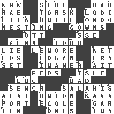 ACROSS 1. Compass dir. 4. Change direction abruptly 8. Drinking establishment 11. Actress Charlotte 12. Cod relative 14. Farming town in central California 15. Singer James 17. Join together 18. Southwest Nigerian state 19. Inhabiting a nest 21. Brides' dresses 23. Baseball player Mel 24. Compass dir. 25. _ mater 27. "Corrida" creature 30. Untruth 31. Poe poem 34. Dripping 37. Begley and Asner 38. Utah city north of Ogden 39. Period 40. Arrange properly for use 41. More lacking in sense or substance 43. Small island 44. Vintage cars 45. Small island 47. Nilotic language 49. Male parent 50. Sir (Sp.) 52. Deli grouping 56. Mountain range southwest of Kyrgyzstan 57. The state of being joined or united 60. Polynesian shrub of the pepper family 61. Sweet dark-red dessert wine 62. Learning spot: Fr. 63. Slender fish 64. "___ Little Indians" 65. Washington bills 66. _ tizzy (2 wds.) DOWN 1. Songbird 2. Nathan's nickname 3. Moistens 4. Check the growth or development of 5. Protracted 6. RI univ. 7. Eastern Standard Time (abbr.) 8. Child's nurse 9. Does sums 10. River (Sp.) 13. Cask 14. Moos 16. Tiny particle 20. Slanted text style (abbr.) 22. Bear (Spanish) 25. Helper 26. For fear that 27. Ancient Roman robes 28. Northwest Algerian city 29. French philosopher Descartes 30. French article 32. Writer Wiesel 33. Words to Nanette 34. Welt 35. One of the Great Lakes 36. Make lace 42. Monetary unit of Yemen 44. Friend of Pooh 46. Neighbor of Neb. 47. Acquire or gain knowledge or skills 48. A single undivided whole 49. Natives or inhabitants of Denmark 50. A type of plum 51. Regret 52. Flatfish 53. Wise men 54. "Terrible" tsar 55. "Two Mules for Sister ____" 56. Fitting 58. Non-commissioned officer (abbr.) 59. Electrically charged atom