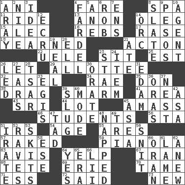 ACROSS 1. Cuckoo 4. Conductor's collection 8. Health resort 11. Travel on an animal 13. At once, immediately (arch.) 14. Cassini of fashion 15. Actor Baldwin 16. Confederate soldiers (slang) 17. To erase 18. Had a strong desire 21. 13-14th century defensive garment 22. Ubangi River tributary 23. Be seated 25. Eastern Standard Time (abbr.) 26. Allow 29. One to whom something is allotted 32. Artist's stand 34. Actress Charlotte 35. Spanish title 38. To draw with force 39. Excessive but superficial compliments 41. Length times width 43. Indian title of respect (Mr.) 44. Car dealer's back yard 45. Collect or gather 46. SAT takers 50. R.R. building 51. Big collection agency 54. Ripen 55. Ancient Greek god of war 57. Swept the length of 59. Player piano 63. Deliberation 64. Sharp bark 67. SW Asia republic 68. Wig 69. 4th largest of the Great Lakes 70. Not wild 71. Curvy letter 72. Alleged 73. ___ Haven, CT DOWN 1. Like ___ of sunshine 2. Mediterranean tributary 3. It may be bright or harebrained 4. Pack 5. One (Scot) 6. Director Reiner 7. Followers of ems 8. Schedule 9. Mexican monetary units 10. Rep 12. Shade of tan 14. The grampus (Milton) 19. Actress Patricia 20. Pipe bend 21. Had dinner 23. Play the lead 24. Detail 26. Directed 27. Hearing organs 28. Russian ruler of old 30. Declaim 31. Dutch treat 33. Armor plate that protects the chest 36. Mouths or openings 37. A home for chicks 39. A hard, heavy blow 40. Method 42. White ___ sheet 45. Toward the sea 47. Small boy 48. Slept 49. Three (prefix) 51. Feeling or showing extreme anger 52. All-night dance parties 53. Burlesque acts 56. In a ____ (agitated or irritated) 58. Compass dir. 60. NW Algerian seaport 61. Unable to walk 62. Afresh 64. Consenting reply 65. Epoch 66. Cards in a Roman deck?