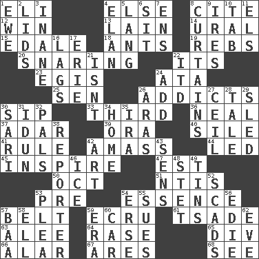 ACROSS 1. Biblical high priest 4. Otherwise 8. Quote 12. Victory 13. (Had) reclined 14. Mountain range 15. Peak District village in England 18. Pismires 19. Confederate soldiers (slang) 20. Catching in a trap 22. It is 23. The front part of a cuirass 24. "One Day ___ Time" 25. Elected rep. 26. Inveterate users 30. Small drink 33. One of three equal parts 36. Anneal 37. The sixth month of the Jewish calendar 39. Mouth or opening 40. Filth; sediment 41. Governing power 42. Collect or gather 44. Directed 45. Stimulate to action 47. Eastern Standard Time (abbr.) 50. Sep. follower 51. Nuclear Threat Initiatives 53. Before (prefix) 54. Substance 57. Waist strap 59. Shade of tan 61. Sadhe (variant) 63. Toward shelter 64. Raze (variant) 65. HTML Container Element 66. Having or resembling wings 67. Ancient Greek god of war 68. Observe DOWN 1. She-sheep 2. Hats (slang) 3. Empty; void 4. Liveliness 5. Austrian-born American filmmaker Fritz 6. Be seated 7. Followers of ems 8. Window treatments 9. Angers 10. Bar bill 11. Raised railways 16. Fails to keep up a pace 17. 4th largest of the Great Lakes 21. Is not 22. It would 24. Increase 26. Caspian sea tributary 27. To provide with a ceiling 28. Falsehood 29. Downhill vehicle 30. Indian skirt 31. Goddess of spring and wife of Bragi 32. Friends 34. Dwelling 35. Retirement account (abbr.) 38. Newsperson 42. Tate display 43. Elected reps. 46. Frozen water 48. Proofreading order 49. Metal containers 52. Loads 53. Entreaty 54. Celtic language 55. Institutes legal proceedings 56. Singer Brickell 57. Sound made by sheep 58. Pipe bend 59. Period 60. Automobile 62. Night before a holiday