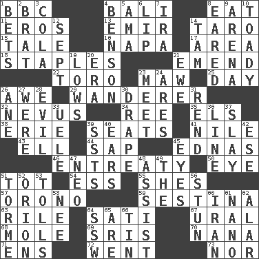 ACROSS 1. English channel? 4. Indonesian resort city 8. Ingest 11. Greek god of love 13. Arab leader 14. Pacific island yam 15. Story 16. California wine valley 17. Length times width 18. Paper fasteners 21. Make improvements or corrections to 22. "Corrida" creature 23. Informal term for the mouth 25. 24 hours 26. Deep reverence 29. Roamer 32. Congenital growth or mark on the skin 34. Portuguese money of account (variant) 35. Raised railways 38. One of the Great Lakes 39. Theater features 41. "Death on the ____" 43. Pipe bend 44. Plant excrement 45. Ferber et al. 46. Plea 50. Sight organ 51. Small child 54. Curvy letter 55. "______ My Girl" (Turtles hit) 57. U. of Maine site 59. French poetic form 63. Cause heat under the collar 64. Suttee (variant) 67. Mountain range 68. Undercover agent 69. Indian titles of respect 70. Grandmother 71. Followers of ems 72. Gone 73. And not DOWN 1. Stakes 2. Naughty child 3. Root beer relative 4. Gillaume's butler role 5. Housemaid (var.) 6. Mouth edge 7. Retirement account (abbr.) 8. Having ears or earlike features 9. Sports stadium 10. Sycophant 12. Back-to-school mo. 14. Scottish cap 19. Moos 20. Period 21. She-sheep 23. Rendezvous 24. Ancient Greek god of war 26. A saturated hydrocarbon 27. We are 28. Morally bad or wrong 30. Window treatment 31. Tear apart 33. Ubangi River tributary 36. Actor's bit 37. Kill 39. Fast planes 40. Hearing organs 42. Compass dir. 45. Sight organs 47. Modern: prefix 48. Help 49. Definite Article 51. Singer Mel 52. Greek mythologigal hunter 53. For Whom the Bell _____ 56. Astound 58. Born 60. SW Asia republic 61. Billionth: prefix 62. Having or resembling wings 64. Compass dir. 65. "We ___ not amused" (Victoria) 66. Metal container