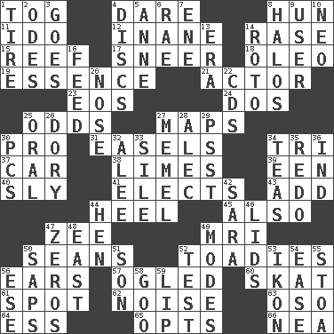 ACROSS 1. Coat; cloak 4. Have the gumption 8. Attila the _ 11. Wedding promise 12. Lacking in sense or substance 14. To erase 15. Coral collection 17. Scornful expression 18. Butter sub 19. Core 21. Thespian 23. Greek goddess of the dawn 24. Two (Sp.) 25. Likelihood 27. Atlas contents 30. Adept person 31. Artist's stands 34. Three (prefix) 37. 4-wheeled motor vehicle 38. Citrus fruits 39. Car or cant ending 40. Wily 41. Chooses 43. Find the sum of 44. Person who is morally reprehensible 45. In addition 47. Last letter of the English alphabet 49. Medical imaging device (abbr.) 50. Actors Connery and Penn 52. Sycophants 56. Hearing organs 57. Stared 60. Three-handed card game 61. Blemish 62. Annoying sound 63. Bear (Spanish) 64. Curvy letter 65. Elects 66. Teachers' org. DOWN 1. Become fatigued 2. Lyric poems 3. Moves 4. Flat circles 5. Queen of England 1702-14 6. Actress Charlotte 7. Compass dir. 8. Rings 9. One who makes use of a thing 10. Modern: prefix 13. Epoch 14. Printing process, for short 16. Nourish 20. Olfactory organ 22. Music discs 25. Taken by mouth 26. Small, narrow, flatbottom fishing boat 27. Klaipeda city 28. Actor Baldwin 29. Inconspicuous attention getter 30. Personal Computers (abbr.) 32. Toward shelter 33. Filth; sediment 34. Beverages made from leaves 35. Redecorate 36. Working for oneself (abbr.) 42. "Two Mules for Sister ____" 44. Layer 46. Hats (slang) 47. Nothings 48. 90 degrees 49. Methods 50. Plant excrements 51. Male child 52. Trial 53. Visual representation of an object 54. Relaxation 55. Portico 56. Compass dir. 58. Thick or sticky substance 59. Mouth edge
