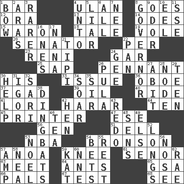 ACROSS 1. Long, evenly shaped piece 4. ____ Bator, Mongolia 8. Moves 12. Mouth or opening 13. The longest river in the world 14. Lyric poems 15. Make _____ (do battle with) 18. Story 19. Grand slam 20. Elected representative 22. For each 23. Painter Guido (1575-1642) 24. Slender fish 25. Plant excrement 26. Pre-World Series prize 30. Part of HMS, perhaps 33. Come out of 36. Mitch Miller's instrument 37. Mild oath 39. Petroleum 40. Travel on an animal 41. Australian parrot (variant) 42. Ethiopian city, capital of Harari 44. "___ Little Indians" 45. Hard copy producer 47. Compass dir. 50. Commissioned mil. rank 51. Small valley 53. Basketball assoc. 54. "Death Wish" actor 57. Small Philippine buffalo 59. Leg joint 61. Sir (Sp.) 63. Rendezvous 64. Pismires 65. Girls' org. (abbr.) 66. Friends 67. Trial 68. Perceive with the eye DOWN 1. Ribbon knot 2. Caspian sea tributary 3. Less widely known 4. To (old English) 5. One who doesn't tell the truth 6. 100% 7. Born 8. Head of state? 9. Scent 10. Snakelike fish 11. Compass dir. 16. Singles 17. Nanny 21. Native american tent (variation) 22. Baking dish 24. Unit of force equal to gravity 26. Monetary unit of Botswana 27. "This won't hurt ____!" 28. Connecting point 29. Adolescent 30. Aid 31. Composer Stravinsky 32. Indian skirt 34. Fly high 35. Title for a knight 38. Empty-headed or silly people 42. Layer 43. Do over again 46. Afternoon social gathering 48. Elected reps. 49. Otherwise 52. Yearns 53. Christmas carol 54. Wagers 55. Remainder 56. Olfactory organ 57. Electrical Unit 58. Teachers' org. 59. Krazy ___ of comics 60. Compass dir. 62. Actress Charlotte
