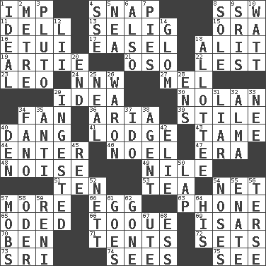 ACROSS 1. Naughty child 4. Fastener 8. Compass dir. 11. Small valley 13. Major League Baseball Commissioner Bud 15. Mouth or opening 16. Needle holder 17. Artist's stand 18. Came down and settled, as after flight 19. Nick name for Arthur 21. Bear (Spanish) 22. For fear that 23. Lion 24. Compass dir. 27. Cartoonist voice _ Blanc 29. The main thing one is thinking about 30. Pitcher Ryan 34. Air blower 36. Operatic vocal solo 39. Vertical member of a panel or frame 40. Mild oath, euphamism for damn 41. Inn 43. Docile 44. Keyboard key 46. Christmas carol 47. Period 48. Annoying sound 49. The longest river in the world 51. Nine, plus one 53. Afternoon social gathering 54. Fish or hair follower 57. Greater amount 60. Ovum 63. Give a jingle 65. Wrote a lyric poem 66. Woman's close-fitting hat 69. Austrian river, tributary to the Danube 70. Benjamin's nick name 71. Portable shelters 72. Puts into a specified state 73. Indian title of respect (Mr.) 74. Perceives with the eye 75. Perceive with the eye DOWN 1. Standard of perfection 2. Distance measurement (Brit.) 3. Cartoon dog 4. Compass dir. 5. Teachers' org. 6. In addition 7. Sliced desserts 8. Not divided or shared with others 9. Indian titles of respect 10. Electrical Unit 12. Cards in a Roman deck? 14. Seize upon or latch onto something 18. One to whom something is allotted 20. Conclude 25. Actress Patricia 26. Make _____ (do battle with) 28. Followers of ems 29. Swallowed 31. One who doesn't tell the truth 32. _ mater 33. Born 34. Papal veil 35. Opposed to 37. Wedding promise 38. Representative 40. Lair 42. Writer Wiesel 45. To separate or throw off 50. Infant locale 52. Remaining after all deductions 54. Olfactory organs 55. Related on the mother's side 56. Laconic 57. Crowds into 58. River in Europe 59. Painter Guido (1575-1642) 61. Leaves 62. Went 64. Part of HMS, perhaps 67. Shoshoni 68. Curvy letter