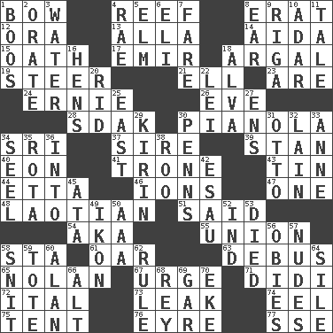 ACROSS 1. Ribbon knot 4. Coral collection 8. Part of Q.E.F. 12. Mouth or opening 13. Silent film actress Nazimova 14. Opera by Verdi 15. Pledge 17. Independent ruler or chieftain 18. Therefore, facetiously 19. Navigate 21. Pipe bend 23. "We ___ not amused" (Victoria) 24. Bert's buddy 26. Night before a holiday 28. Neighbor of Neb. 30. Player piano 34. Indian title of respect (Mr.) 37. Title for a man of rank and authority 39. Comedian Laurel of Laurel & Hardy 40. A really long time 41. Marketplace scale 43. Shallow baking pan 44. Singer James 46. Charged particles 47. Single 48. Of or relating to Laos or its people 51. Alleged 54. Alias (abbr.) 55. The state of being joined or united 58. R.R. building 61. Rowing implement 63. Alight from a bus 65. Pitcher Ryan 67. Goad 71. "You Light Up My Life" star Conn 72. Slanted text style (abbr.) 73. Path through which fluid escapes 74. Snakelike fish 75. Portable shelter 76. Jane of fiction 77. Compass dir. DOWN 1. Scornful sounds 2. Declaim 3. Wetness 4. Actress Charlotte 5. Shade tree 6. Connecticut Ivy Leaguer 7. Conductor's collection 8. Hearing organ 9. Port city in Latvia 10. The sixth month of the Jewish calendar 11. Story 16. Coop moms 18. Inventor's middle name 20. To free from 22. Luau accessory 25. Compass direction 27. Followers of ems 29. Japanese brewing company 30. Actor Sean's family 31. "Beetle Bailey" pooch 32. (Had) reclined 33. Queen of England 1702-14 34. Stitch closed the eyes of (a falcon) 35. Roll call or roster of names 36. To the inside or interior of 38. Friend of Pooh 42. Son of Isaac 45. _ moment's notice (2 wds.) 49. Picture 50. Auto club (abbr.) 52. Working for oneself (abbr.) 53. Passed on 56. Off-Broadway awards 57. Unadorned figures 58. In a ____ (agitated or irritated) 59. Lug 60. Actor Alda or Thicke 62. General guideline 64. Drop; flow; fall 66. Keyboard modifier key 68. Marina Del _, California 69. Slender fish 70. Supplement with great effort