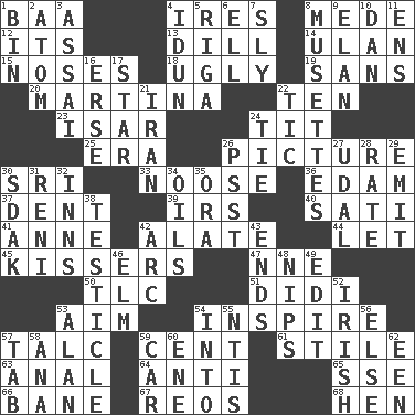 ACROSS 1. Sound made by sheep 4. Angers 8. Ancient Persian 12. ___ a Wonderful Life 13. Deli pickle 14. ____ Bator, Mongolia 15. Olfactory organs 18. Repulsive 19. Without 20. Chrissie's court nemesis 22. Nine, plus one 23. Austrian river, tributary to the Danube 24. Teat (slang) 25. Period 26. Photo 30. Indian title of respect (Mr.) 33. Trap for birds or small mammals 36. Dutch treat 37. Incision 39. Big collection agency 40. Suttee (variant) 41. Queen of England 1702-14 42. Having winglike extensions 44. Allow 45. Smoochers 47. Compass dir. 50. Affectionate concern, for short 51. "You Light Up My Life" star Conn 53. Direct toward a target or goal 54. Heighten or intensify 57. Baby powder 59. Penny 61. Vertical member of a panel or frame 63. Of or related to the anus 64. Opposed to 65. Compass dir. 66. Object of repulsion 67. Vintage cars 68. Layer DOWN 1. Storage container 2. Tiny particle 3. Slender Brazilian palm 4. Goddess of spring and wife of Bragi 5. Port city in Latvia 6. Pipe bend 7. Cunning 8. French bagpipes 9. Flair 10. Daniel's nick name 11. Followers of ems 16. Celtic language 17. Play the lead 21. SW Asia republic 22. Nervous spasm 24. Make a knot 26. Inconspicuous attention getter 27. Freehold land 28. Pace 29. Give off 30. Neighbor of Neb. 31. Painter Guido (1575-1642) 32. Lodging establishments 34. Petroleums 35. Mouth or opening 38. A testis 42. Curve 43. Conclusions 46. Shade tree 48. Pinches, bites 49. Prepare for publication 52. From or relating to Ireland 53. ____ Jay Lerner 54. To the inside or interior of 55. Nuclear Threat Initiatives 56. Otherwise 57. Bar bill 58. Santa ___, CA 59. 4-wheeled motor vehicle 60. Compass dir. 62. Car or cant ending