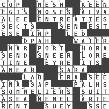 ACROSS 1. Police officer (slang) 4. Tender 8. Peachy ____! 12. Armor plate that protects the chest 14. Olfactory organs 16. Inventor's middle name 17. Toward shelter 18. Pleas 20. Religious groups 22. Elected rep. 23. Eastern Standard Time (abbr.) 24. Compass dir. 25. Mischievous child 28. Directed 30. Brightly colored fish 31. Wetness 35. Impair 37. Sweet dark-red dessert wine 40. Israeli folk dance 41. Transmit 42. Scornful expression 44. Old wives' tales, e.g. 45. Prong on a fork 46. Jane of fiction 47. ___ a Wonderful Life 48. Approach 50. "Two Mules for Sister ____" 52. Experiment locale 54. Period 55. Perceive with the eye 58. _ tizzy (2 wds.) 61. Plant excrement 63. Insides of hands 65. Wine waiters 70. Set of matching outer garments 71. At sea 72. Klaipeda city 73. Johnson of "Laugh-In" 74. Monthly bill 75. Chop _ 76. Compass dir. DOWN 1. Stop 2. Stares at amorously 3. Component 4. Compass dir. 5. Age 6. Fast jet (abbr.) 7. Possessive pronoun 8. Krazy ___ of comics 9. Writer Wiesel 10. Nights before holidays 11. Political cartoonist Thomas 13. Arrange properly for use 15. Sew up the eyelids of hawks and falcons 19. Afresh 21. Small drink 26. Atlas contents 27. Give a jingle 29. A pale violet or amethyst color 30. Severe or trying experience 32. A blast of a horn 33. Blunders 34. Actress Charlotte 35. Count _ (2 wds.) 36. Queen of England 1702-14 38. Marina Del _, California 39. Laconic 41. R.R. building 43. Buttocks 49. Raze (variant) 51. Strike 53. Lip ointment 55. Disparaging remarks 56. Sends forth 57. First name in cosmetics 58. Austrian river, tributary to the Danube 59. Olfactory organ 60. So be it 62. Sliced desserts 64. White ___ sheet 66. Floor covering 67. Australian flightless bird 68. To separate or throw off 69. Mischievous