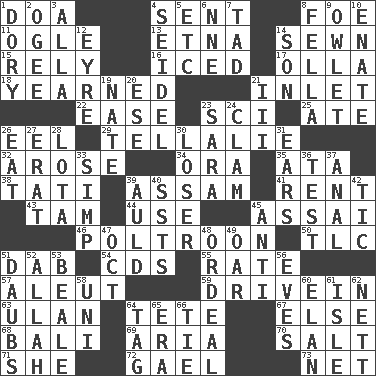 ACROSS 1. ___ good deed 4. Emitted 8. Enemy 11. Stare at amorously 13. Inactive volcano in Sicily 14. Stitched 15. Have confidence or faith in 16. On the rocks 17. Spanish pot 18. Felt deep pity or tenderness 21. An arm off of a larger body of water 22. Relaxation 23. _-fi 25. Had dinner 26. Snakelike fish 29. Copy Pinocchio 32. Came up 34. Mouth or opening 35. "One Day ___ Time" 38. Jacques of French films 39. Indian state 41. Monthly bill 43. Scottish cap 44. Purpose 45. Slender Brazilian palm 46. Coward 50. Affectionate concern, for short 51. Apply (a substance) by light strokes 54. Music discs 55. Pace 57. Eskimo relative 59. Popular '50s hangout 63. ____ Bator 64. Wig 67. Otherwise 68. Indonesian resort city 69. Roberta Peters solo 70. Table seasoning 71. A female animal or person 72. Highlander 73. Fish or hair follower DOWN 1. Rowboat 2. Double curve, resembling the letter S 3. Silent film actress Nazimova 4. Beer mug 5. And so on (abbr.) 6. Compass dir. 7. Bit 8. Man or boy (slang) 9. A small or young owl 10. Related on the mother's side 12. Jane of fiction 14. Manchild 19. Nathan's nickname 20. Compass dir. 21. One more than two 23. "Two Mules for Sister ____" 24. Dollar (slang) 26. Ingest 27. Part of Q.E.F. 28. Globular water bottle used in Asia 30. Failure 31. Hearing organs 33. Simple or foolish person 36. Trial 37. Of or related to the anus 39. Old (Scot.) 40. Fast planes 42. Nervous spasm 45. Against 47. Sep. follower 48. Severe or trying experience 49. Boat paddle 51. Applies to a surface 52. Assad's deity 53. Calif. Air Force Base 56. Nights before holidays 58. Corn or form start 60. Flair 61. Small island 62. Remaining after all deductions 64. Label 65. Epoch 66. Standoff