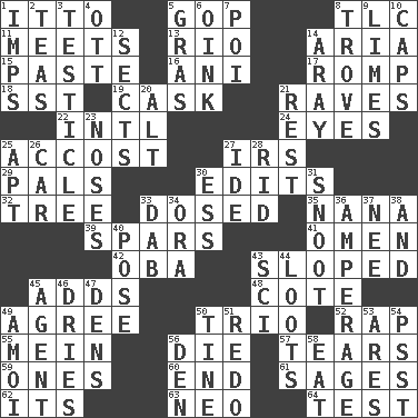 ACROSS 1. "Tell ____ the Marines!" 5. Republican Party 8. Affectionate concern, for short 11. Confronts 13. _ de Janeiro 14. Roberta Peters solo 15. Thick mixture 16. Cuckoo 17. Frolic 18. Fast jet (abbr.) 19. Keg 21. All-night dance parties 22. International (abbr.) 24. Sight organs 25. Buttonhole 27. Big collection agency 29. Friends 30. Prepares for publication 32. Family _ (genealogy) 33. Administered medicine 35. Nanny 39. Practice fights 41. Presage 42. Chief or king in Benin or Nigeria 43. Slanted 45. Sums up 48. ____ d'Azur (French Riviera) 49. Match 50. Musical group of three 52. Reproach for some lapse or misdeed 55. Chow _ 56. Expire 57. Pulls into pieces 59. Washington bills 60. Conclusion 61. Gurus 62. It is 63. Modern: prefix 64. Trial DOWN 1. Naughty children 2. Beverages made from leaves 3. One of the two male reproductive glands 4. Baseball player Mel 5. Pate de foie ____ 6. Pig sound 7. Luau course 8. Collection of objects 9. Citrus fruits 10. Smile enhancers 12. Religious groups 14. Like ___ of sunshine 20. The first octave above the treble staff 21. Repose 23. Olfactory organs 25. Fitting 26. Automobile 27. Binary compound 28. To free from 30. Curvy letter 31. Snout, nose 33. Small moist lump or mass 34. Mouth or opening 36. Electrical Measurement 37. Born 38. Added to 40. Airs 43. _-fi 44. Plunders 45. Rep 46. Frees from moisture 47. Hiding places for outlaws 49. Mine, in Marseilles 50. Prong on a fork 51. Make new 53. Ancient Greek god of war 54. Inconspicuous attention getter 56. Lair 58. Erode