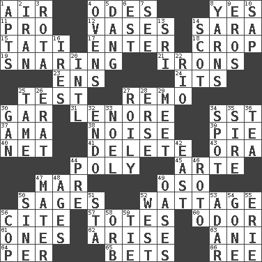 ACROSS 1. Atmosphere 4. Lyric poems 8. Affirmative reply 11. Adept person 12. Flower holders 14. "Two Mules for Sister ____" 15. Jacques of French films 17. Keyboard key 18. Riding implement 19. Catching in a trap 21. Removes the wrinkles 23. Followers of ems 24. It is 25. Trial 27. San ____ (Riviera town) 30. Slender fish 31. Poe poem 34. Fast jet (abbr.) 37. Nursemaid (var.) 38. Annoying sound 39. Sliced dessert 40. Fish or hair follower 41. Erase 43. Mouth or opening 44. Much (prefix) 45. Johnson of "Laugh-In" 47. Make imperfect 49. Bear (Spanish) 50. Gurus 52. Electrical Measurement 56. Quote 57. Lugs 60. Scent 61. Washington bills 62. Ascend 63. Cuckoo 64. For each 65. Antes 66. To separate or throw off DOWN 1. Tenement units (abbr.) 2. SW Asia republic 3. Round or rotation of duties 4. Baking chambers 5. Mild oath, euphamism for damn 6. Eastern Standard Time (abbr.) 7. Observe 8. Entertaining tales 9. Greek god of love 10. Plant excrement 13. Indian title of respect (Mr.) 14. Highlander 16. Angers 20. International (abbr.) 22. _ de Janeiro 25. Not wild 26. Part of Q.E.F. 27. Agitated, as a liquid 28. Celtic language 29. Rendezvous 30. Separate the seeds from cotton 32. Inside; within (prefix) 33. Christmas carol 34. Blemish 35. Father 36. Afternoon social gathering 42. 90 degrees 44. Before (prefix) 46. Printing process, for short 47. Mother 48. Eras 49. Fertile tracts in a desert 50. Trig term 51. R.R. building 52. 270 degrees 53. The sixth month of the Jewish calendar 54. Went 55. 4th largest of the Great Lakes 56. Police officer (slang) 58. Globe 59. Neckwear