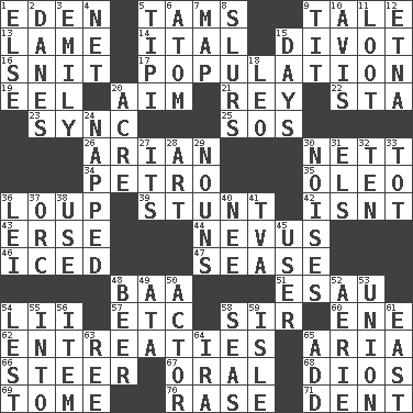 ACROSS 1. Paradise 5. Scottish caps 9. Falsehood 13. Unable to walk 14. Slanted text style (abbr.) 15. A piece of turf (Scot.) 16. In a ____ (agitated or irritated) 17. Census information 19. Snakelike fish 20. Direct toward a target or goal 21. Marina Del _, California 22. R.R. building 23. Synchronize (abbr.) 25. Mayday 26. Believer in; advocate of (suffix) 30. Remaining after all deductions 34. Stone: prefix 35. Butter sub 36. Central Nebraska county 39. Difficult or unusual or dangerous feat 42. Is not 43. Celtic language 44. Mole, birthmark 46. On the rocks 47. Gospel singer Marvin 48. Sound made by sheep 51. Son of Isaac 54. Cards in a Roman deck? 57. And so on (abbr.) 58. Title for a knight 60. Compass dir. 62. Pleas 65. Roberta Peters solo 66. Guide 67. Relating to the mouth 68. "Vaya con ____" 69. Heavy book 70. To erase 71. Scratch DOWN 1. Otherwise 2. Natives or inhabitants of Denmark 3. Poet Dickinson 4. Fish or hair follower 5. Native american tent (variation) 6. Smallest unit of an element 7. Atlas unit 8. Disparaging remarks 9. Teat (slang) 10. Deliberation 11. Spoils 12. Inactive volcano in Sicily 15. 24-hour periods 18. Lion 20. 43,560 square feet 24. Slept 27. ___ a Wonderful Life 28. Tate display 29. Parts of speech 30. Annoying sounds 31. Raised railways 32. "___ Little Indians" 33. Small child 36. Luau accessory 37. The grampus (Milton) 38. Purpose 40. Born 41. Federal power corp. 45. One who uses or employs something 48. Fermented drink made from hops 49. "One Day ___ Time" 50. Thespian 52. Nest on high 53. The state of being joined or united 54. For fear that 55. To the inside or interior of 56. Detail 58. Oceans 59. Small island 61. 90 degrees 63. To separate or throw off 64. Lyricist Gershwin 65. Find the sum of