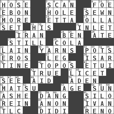 ACROSS 1. Stockings 5. Examine hastily 9. Enemy 12. Inky black, to poets 13. Opening into or through something 14. Stitched 15. Greater amount 16. Singer James 17. Water jar 18. Arrange properly for use 19. Part of HMS, perhaps 21. An arm off of a larger body of water 22. SW Asia republic 24. Benjamin's nick name 26. Had dinner 27. Free from disturbance or agitation 28. Root beer relative 29. (Had) reclined 30. Entertaining tales 32. Cooking vessels 36. Greek god of love 37. Part of a journey 38. Austrian river, tributary to the Danube 39. Prong on a fork 40. Traditional theme or motif 42. Needle case 43. Loyal 44. It is permitted: Lat. 46. Perceive with the eye 49. Assist 50. An important port of Yemen 51. Taiwanese island in East China Sea 53. Grow older 54. Player for Phoenix 57. American tennis player Robert 58. Mild oath, euphamism for damn 61. Grain storage tower 62. It's straight from the horse's mouth 63. Soon (poet.) 64. "Terrible" tsar 65. Affectionate concern, for short 66. "You Light Up My Life" star Conn 67. Former U.S. Attorney General Janet DOWN 1. Cloth borders 2. Mitch Miller's instrument 3. Conclusion 4. Compass dir. 5. "______ My Girl" (Turtles hit) 6. Small bed 7. Keyboard modifier key 8. Teachers' org. 9. Man or boy (slang) 10. A small or young owl 11. Maternal 14. Male offspring 19. Actor Linden 20. Inwardly 21. _ tizzy (2 wds.) 23. Remove soap 24. Beat drum 25. Raised railways 27. Indian skirt 28. Streamer paper 29. Allow 31. Verbally 32. Part 33. Clearly or manifestly demonstrative 34. Pulled tight 35. Indian title of respect (Mr.) 40. Three (prefix) 41. Volcanic refuse 43. The 19th letter of the Greek alphabet 45. Binary compound 46. Don Adams' spy role 47. Artist's stand 48. Moral principle 52. Elected rep. 53. Hindu god of fire 55. ____ Bator 56. Words to Nanette 58. Male parent 59. Cuckoo 60. Dreamland 61. Title for a knight