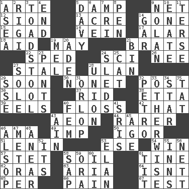 ACROSS 1. Johnson of "Laugh-In" 5. Moist 9. Fish or hair follower 12. The Jewish people; Israel 13. 1/640 square mile 14. Went 15. Mild oath 16. Distinctive style or manner 17. Having or resembling wings 18. Assist 19. Can I? 21. Naughty children 22. Hurried 24. _-fi 26. Born 27. Having lost freshness 28. Uhlan (variant) 29. Within a short period 30. Music written for nine 32. Mail 36. Narrow opening 37. To free from 38. Singer James 39. Snakelike fish 40. Soft thread for cleaning between teeth 42. Not this but _ 43. Period of immesurable duration 44. Less widely known 46. Nanny (var.) 49. Naughty child 50. Composer Stravinsky 51. Soviet premier 1918-24 53. Compass dir. 54. Acquire through effort 57. Proofreading order 58. Earth 61. Prong on a fork 62. Mouths or openings 63. Roberta Peters solo 64. Is not 65. For each 66. Ache 67. Trial DOWN 1. At sea 2. Swiss mountan, "Queen of the Mountains" 3. Inedible or poisonous agaric 4. Conclusion 5. American folk hero Crockett 6. Adept person 7. Medical imaging device (abbr.) 8. Writing instrument 9. Pitcher Ryan 10. Related on the mother's side 11. Laconic 14. Slender fish 19. Cartoonist voice _ Blanc 20. Arabian gulf 21. Storage container 23. Leg coverings 24. Bobsleighs 25. Feline 27. Flatfish 28. The state of being joined or united 29. Compass dir. 31. Fourth or lowest deck 32. Stone: prefix 33. Else 34. Play the lead 35. Make lace 40. Opposite of masc. 41. Indian titles of respect 43. The 18th letter of the Arabic alphabet 45. Mature 46. Columnist Joseph or Stewart 47. Distance measurement (Brit.) 48. Approach 52. It is 53. Enthusiasm 55. Lodging establishments 56. Remaining after all deductions 58. Plant excrement 59. Mouth or opening 60. One more than two 61. Teat (slang)