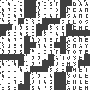 ACROSS 1. Baby powder 5. A home for chicks 9. Sound made by sheep 12. Type of rug 13. Von Bismarck 14. Lightbulb-shaped fruit 15. Hitchcock's "____ Window" 16. Scram! 17. Indian skirt 18. Pacific Standard Time (abbr.) 19. Make supply last 21. Grain storage towers 22. Flexible conduit 24. What Jean-Claude Killy likes to do 26. Compass dir. 27. Gospel singer Marvin 28. Play the lead 29. Small pie 30. Music written for nine 32. 43,560 square feet 36. Malaysian steamed pastry 37. Actress Charlotte 38. Supercomputer manufacturer 39. Likelihood 40. Seductive woman who exploits men 42. Lug 43. Instrument 44. Came up 46. Chicken ___ king 49. Chop off 50. Habitations of wild animals 51. Pale purple color 53. Compass dir. 54. Soggy 57. Came down and settled, as after flight 58. Root beer relative 61. Not divided or shared with others 62. Prong on a fork 63. To be drawn or hauled along 64. One of the Great Lakes 65. Compass dir. 66. Plant excrements 67. An important port of Yemen DOWN 1. Canvas cover 2. Ancient Greek god of war 3. Tough but pliablecoriaceous 4. Auto 5. Olfactory organ 6. And so on (abbr.) 7. R.R. building 8. Small child 9. Calif. Air Force Base 10. Composer Copland 11. Originate 14. Air pressure measure (abbr.) 19. Double-curved letter 20. Peachy ____! 21. Title for a knight 23. Expletives 24. Navigate 25. Krazy ___ of comics 27. Saudi Arabian king (1953-1964) 28. Slow-paced one 29. Ring climax 31. Fourth or lowest deck 32. Gambison 33. What you're doing now 34. Pace 35. Sight organ 40. Egg _ yung 41. Small amounts or degrees 43. Affectionate concern, for short 45. Portuguese money of account (variant) 46. Having winglike extensions 47. Ms. Damita and namesakes 48. Place in a line 52. Had dinner 53. Settles 55. Writer Wiesel 56. Adolescent 58. Music discs 59. Mouth or opening 60. Pet locale 61. Ocean