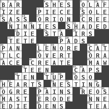 ACROSS 1. Tavern 4. "______ My Girl" (Turtles hit) 8. Norwegian king 12. Ending with capital 13. Part 14. Not divided or shared with others 15. Backtalk 17. Constellation of myth 18. Algonquian 19. Fools 21. Cast a shadow over 23. Expire 24. R.R. building 26. Big collection agency 27. Wig 28. Writing tablets 30. Baking dish 31. Poe poem 34. Domesticated feline 37. Affectionate concern, for short 38. Unconcealed 39. Mouth or opening 40. Adept person 41. Make 42. Informal term for the mouth 43. Adolescent 44. Smile enhancers 46. "___ Little Indians" 47. Uncastrated adult male sheep 50. Bear (Spanish) 51. Centers 54. Inhabiting a nest 57. Legendary monster 58. Aches 60. Vintage cars 62. Vertical spar for supporting sails 63. Wear away 64. Compass dir. 65. Singer Brickell 66. Lairs 67. Beverage made from leaves DOWN 1. Again 2. Muslim summons to prayer 3. Dwelling 4. Begets 5. Robbery 6. Environmental prefix 7. Elected reps. 8. Motion picture awards 9. Nobles 10. Toward shelter 11. Nourish 13. Luau course 16. In a ____ (agitated or irritated) 20. Born 22. Flintstone garb 25. To the left, to Queeg 27. Baby powder 29. Johnson of "Laugh-In" 30. Parent Teacher Association (abbr.) 31. Old wives' tales, e.g. 32. Incident 33. Teachers' org. 34. Piece 35. Caspian sea tributary 36. The 23rd letter of the Hebrew alphabet 41. Penny 43. Cigar-shaped 44. Small bed 45. SW Saudi Arabia district 46. Tarsus (plural) 48. The state of being joined or united 49. Hangs 51. Dwelling 52. Mild oath 53. Broke a traffic law 55. Compass dir. 56. Went 59. "We ___ not amused" (Victoria) 61. Ocean