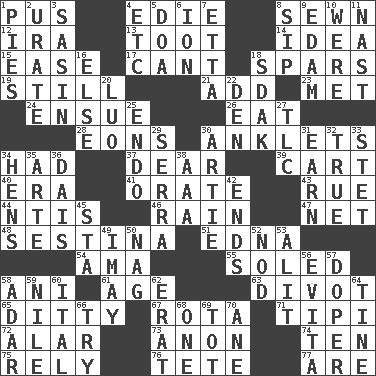 ACROSS 1. Festering 4. Singer Brickell 8. Stitched 12. Retirement account (abbr.) 13. A blast of a horn 14. The main thing one is thinking about 15. Comfort 17. Patter 18. Practice fights 19. Free of sound 21. Increase 23. Was introduced to 24. Take place subsequently 26. Consume 28. Immeasurably long periods of time 30. Short socks 34. Possessed 37. Letter starter 39. Heavy open wagon 40. Period 41. Declaim 43. Sorrow 44. Nuclear Threat Initiatives 46. Precipitation 47. Fish or hair follower 48. French poetic form 51. Pulitzer Prize-winning author Ferber 54. Nursemaid (var.) 55. Having a sole or soles 58. Cuckoo 61. Mature 63. A piece of turf (Scot.) 65. Short, simple song 67. Roll call or roster of names 71. Native american tent (variation) 72. Having or resembling wings 73. At once, immediately (arch.) 74. Nine, plus one 75. Trust 76. False hair 77. "We ___ not amused" (Victoria) DOWN 1. Sliced desserts 2. A salt of uric acid 3. Indian antelope 4. And so on (abbr.) 5. ___ good deed 6. Electrically charged atom 7. Singer James 8. Small drink 9. Dutch treat 10. We are 11. Political cartoonist Thomas 16. Otherwise 18. Neighbor of Neb. 20. Nilotic language 22. Lair 25. Inside; within (prefix) 27. Affectionate concern, for short 29. Spanish missionary in California 30. Nick name for Arthur 31. Merit 32. Loyal 33. Proofreading order 34. Coop moms 35. Johnson of "Laugh-In" 36. Raised platform 38. American Automobile Association (abbr.) 42. Conclusions 45. R.R. building 49. "If ____ say so..." 50. Tired old horse 52. Dreamland 53. Came down and settled, as after flight 56. Webber/Rice musical 57. Drug addict 58. The sixth month of the Jewish calendar 59. Mediterranean tributary 60. Slanted text style (abbr.) 62. Part of Q.E.F. 64. Prong on a fork 66. Attempt to accomplish something 68. Single 69. Small child 70. A saturated hydrocarbon