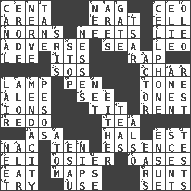 ACROSS 1. Penny 5. Tired old horse 8. Corporate head (abbr.) 11. Length times width 12. Part of Q.E.F. 14. Pipe bend 15. Typical models 17. Confronts 18. Falsehood 19. Contrary to your interests or welfare 21. Ocean 22. Lion 23. Area sheltered from the wind 24. ___ a Wonderful Life 25. Hit sharply and swiftly 27. Distress signal 28. Burn to charcoal 31. Desk light 35. Fenced enclosure 37. Heavy book 38. Toward shelter 39. Observe 41. Washington bills 42. Charged particles 43. Teat (slang) 45. Monthly bill 46. Redecorate 47. Afternoon social gathering 49. White ___ sheet 51. Actor Linden 52. Eastern Standard Time (abbr.) 55. Apple computer (short form) 57. Nine, plus one 60. Substance 62. Biblical high priest 63. Flexible twig of a willow tree 65. Fertile tracts in a desert 66. Consume 67. Atlas contents 68. The smallest animal of a litter 69. Attempt to accomplish something 70. Purpose 71. Puts into a specified state DOWN 1. Lessep's creation 2. Eat (away) 3. Effrontery 4. Docile 5. Born 6. Ancient Greek god of war 7. Yard entry 8. Portable communications device 9. Writer Wiesel 10. Margarine 13. Russian ruler of old 16. Indian titles of respect 17. Makes clutter 20. Cease 26. Thespian 29. So be it 30. Remainder 31. Den 32. Medicinal plant 33. Ananias' fault 34. Mexican monetary units 36. Fish or hair follower 40. One or the other 44. Afternoon social gatherings 48. In addition 50. Tiny particle 52. Follow as a consequence or result 53. Aroma 54. Trials 55. Rendezvous 56. Having or resembling wings 58. He sold his birthright 59. Pinches, bites 61. Hearing organs 64. Compass dir.