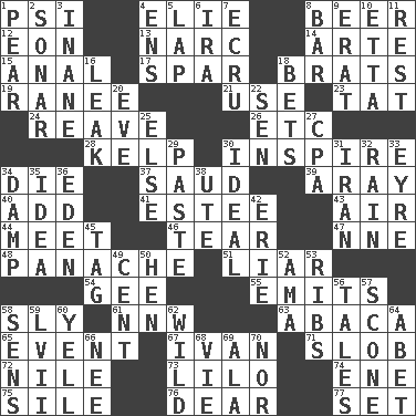 ACROSS 1. Air pressure measure (abbr.) 4. Writer Wiesel 8. Fermented drink made from hops 12. A really long time 13. Drug cop 14. Johnson of "Laugh-In" 15. Of or related to the anus 17. Coast Guard woman 18. Naughty children 19. Indian princess (variant) 21. Purpose 23. Make lace 24. Break or tear apart 26. And so on (abbr.) 28. Seaweed 30. Stimulate to action 34. Expire 37. Saudi Arabian king (1953-1964) 39. Like ___ of sunshine 40. Say or write further 41. First name in cosmetics 43. Atmosphere 44. Confront 46. Pull apart 47. Compass dir. 48. Flamboyance 51. One who doesn't tell the truth 54. Turn to the right 55. Sends forth 58. Secret 61. Compass dir. 63. Phillipine bananalike plant 65. Incident 67. "Terrible" tsar 71. Oscar Madison type 72. "Death on the ____" 73. _ and Stitch 74. Compass dir. 75. Filth; sediment 76. Letter starter 77. Arrange properly for use DOWN 1. Lightbulb-shaped fruit 2. Echolocation 3. Silly 4. Followers of ems 5. Pet locale 6. Lyricist Gershwin 7. Shade of tan 8. Soap unit 9. Part of Q.E.F. 10. Singer James 11. Respite 16. Path through which fluid escapes 18. Wagers 20. First lady 22. Elected rep. 25. Otherwise 27. Accounting whiz (abbr.) 29. Thick mixture 30. Perfect 31. SW Asia republic 32. Precipitation 33. Jane of fiction 34. Moist 35. It may be bright or harebrained 36. Locale of original sin 38. Shoshoni 42. One of the Great Lakes 45. Label 49. Penny 50. Layer 52. Wet nurse (var.) 53. Teases 56. Lies 57. Biscuitlike quick bread 58. Elected reps. 59. 57 in ancient Rome 60. Shout 62. Rampant 64. Collude with 66. Born 68. Compete 69. Wing 70. Or not