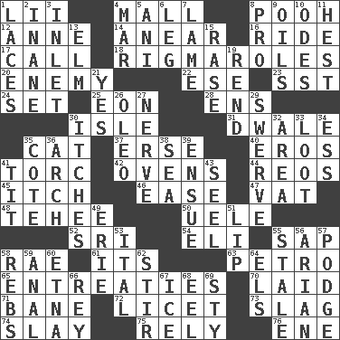 ACROSS 1. Cards in a Roman deck? 4. Shopping center 8. "Silly old bear" 12. Queen of England 1702-14 14. Approach 16. Travel on or in a vehicle 17. Give a ring to 18. Complicated, petty procedures 20. Foe 22. Compass dir. 23. Fast jet (abbr.) 24. Arrange properly for use 25. Age 28. Followers of ems 30. Small island 31. A sleeping potion; an opiate (poet.) 35. Domesticated feline 37. Celtic language 40. Greek god of love 41. Torque (variant) 42. Baking chambers 44. Vintage cars 45. Hankering 46. Relaxation 47. Large container 48. Giggle 50. Ubangi River tributary 52. _ Lanka 54. Biblical high priest 55. Plant excrement 58. Actress Charlotte 61. It is 63. Stone: prefix 65. Pleas 70. Put down 71. Object of repulsion 72. It is permitted: Lat. 73. Volcanic refuse 74. Kill 75. Have confidence or faith in 76. Compass dir. DOWN 1. Shoestrings 2. Lacking in sense or substance 3. An arm off of a larger body of water 4. Spoil 5. Black tropical American cuckoo 6. Part of a journey 7. Unable to walk 8. Adept person 9. Lubricates 10. Lyric poems 11. Behest 13. Shade tree 15. To erase 19. Tear apart 21. Affirmative reply 26. Butter sub 27. Effrontery 29. Turn aside suddenly 30. Strong, restless desires 32. Length times width 33. Spoils 34. Double-curved letter 35. ____ d'Azur (French Riviera) 36. Bowlike part 38. Ocean 39. Take place subsequently 41. Teat (slang) 43. Sew up the eyelids of hawks and falcons 49. 4th largest of the Great Lakes 51. Mouth edge 53. Slanted text style (abbr.) 55. Showing deterioration from age 56. Believer in; advocate of (suffix) 57. Porridge 58. Confederate soldiers (slang) 59. Of or related to the anus 60. Inactive volcano in Sicily 62. Disorderly outburst 64. Raised railways 66. Marina Del _, California 67. Frozen water 68. Snakelike fish 69. Filthy place
