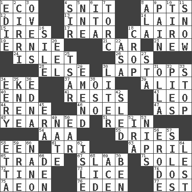 ACROSS 1. Environmental prefix 4. In a ____ (agitated or irritated) 8. Flats, for short 12. HTML Container Element 13. To the inside or interior of 14. (Had) reclined 15. Angers 17. Located in or toward the back 18. Capital of Egypt 19. Bert's buddy 21. Auto 23. ___ Haven, CT 24. Small island 26. Mayday 28. Otherwise 30. Portable computers 34. Make supply last 37. Mine, in Marseilles 39. Came down and settled, as after flight 40. Conclude 41. Musical pauses 43. Lion 44. French philosopher Descartes 46. Christmas carol 47. Viper 48. Felt deep pity or tenderness 51. It's straight from the horse's mouth 54. American Automobile Association (abbr.) 55. Frees from moisture 58. Car or cant ending 61. Three (prefix) 63. Showery time 65. Swap 67. Broad, flat, thick piece 71. Flatfish 72. Prong on a fork 73. Louse (plural) 74. Two (Sp.) 75. A really long time 76. Paradise 77. Eastern Standard Time (abbr.) DOWN 1. Singer Brickell 2. High-altitude cloud 3. Baking chambers 4. Title for a knight 5. Compass dir. 6. Call ___ day 7. Torque (variant) 8. In the manner of 9. Ache 10. Become fatigued 11. Overwhelm 16. Drop; flow; fall 18. Riding implement 20. Snakelike fish 22. White ___ sheet 25. Russian ruler of old 27. R.R. building 29. Make improvements or corrections to 30. 61 cubic inches 31. Spanish pot 32. Sliced desserts 33. Halt 34. Suggestive of the supernatural 35. Leg joint 36. Pulitzer Prize-winning author Ferber 38. Bear (Spanish) 42. Downhill vehicle 45. Period 49. Nathan's nickname 50. Ewer handle 52. Lyricist Gershwin 53. Cuts off 56. Eat (away) 57. Grain storage towers 58. Singer James 59. 4th largest of the Great Lakes 60. Billionth: prefix 62. Capri or Wight 64. For fear that 66. Lair 68. Flaplike covering 69. Adept person 70. Benjamin's nick name