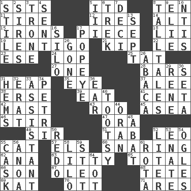 ACROSS 1. Fast planes 5. It would 8. "___ Little Indians" 11. Become fatigued 12. Angers 14. Keyboard modifier key 15. Removes the wrinkles 17. Component 18. Cards in a Roman deck? 19. Small, flat, pigmented spot on the skin 21. Sleep 22. French article 23. Compass dir. 24. Trim (branches) 25. Make lace 27. Single 28. Oblong pieces of solid material 31. Pile 35. Sight organ 37. Toward shelter 38. Celtic language 39. Erode 41. Penny 42. Vertical spar for supporting sails 43. Friend of Pooh 45. Toward the sea 46. Tumult 47. Mouth or opening 49. Title for a knight 51. Bar bill 52. Lion 55. Feline 57. Raised railways 60. Catching in a trap 62. Santa ___, CA 63. Simple song 65. Add up to 66. Male child 67. Margarine 68. False hair 69. Krazy ___ of comics 70. Baseball player Mel 71. Ancient Greek god of war DOWN 1. Vertical member of a panel or frame 2. Founders of families 3. Heavy duty weighing machine 4. Posted 5. One more than two 6. Long journey 7. Tenth: prefix 8. Baron Munchausen's specialties 9. Writer Wiesel 10. Nuclear Threat Initiatives 13. Back-to-school mo. 16. Grain storage tower 17. Wimpy's pal 20. Went 26. Phillipine bananalike plant 29. French philosopher Descartes 30. Stalk of a moss capsule 31. Equivocates 32. Part of Q.E.F. 33. Helper 34. _ dish (used to culture cells) 36. Hearing organ 40. A girl or young woman (variant) 44. Northwest Algerian city 48. Blind as ____ 50. Do over again 52. 61 cubic inches 53. Related on the mother's side 54. Stares at amorously 55. Keg 56. Small Philippine buffalo 58. _ and Stitch 59. Proofreading order 61. Round or rotation of duties 64. Small child