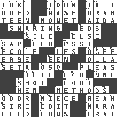 ACROSS 1. Puff or smoke 5. Goddess of spring and wife of Bragi 9. Jacques of French films 13. Wrote a lyric poem 14. To erase 15. Northwest Algerian city 16. Adolescent 17. Music written for nine 18. Opera by Verdi 19. Catching in a trap 21. Begley and Asner 22. Drop; flow; fall 23. Otherwise 24. Plant excrement 27. Directed 28. Inconspicuous attention getter 29. Learning spot: Fr. 31. French article 32. Double curve, resembling the letter S 36. Celtic language 37. Car or cant ending 38. Rounded earthenware pot or jar 39. Stalk of a moss capsule 40. Bear (Spanish) 41. Entreaties 42. Wig 44. Environmental prefix 46. Compass dir. 47. Attempt 48. Plunder 50. Layer 51. Modes 54. Aroma 56. Sibling's daughter 58. 480, 500 or 516 sheets of paper 60. Title for a man of rank and authority 61. Prepare for publication 62. Hindu Mythology: god of death 63. Nourish 64. Immeasurably long periods of time 65. Part of Q.E.F. DOWN 1. Small child 2. Lyric poems 3. Peachy ____! 4. Ferber et al. 5. Pressed 6. Mild oath, euphamism for damn 7. Purpose 8. Fish or hair follower 9. Inedible or poisonous agaric 10. Ascend 11. Bit 12. _ tizzy (2 wds.) 17. "Death on the ____" 20. Cause heat under the collar 21. Raised railways 23. Curvy letter 24. Observes 25. Measure of real estate 26. Mail 28. Fenced enclosure 30. Resembling or made to resemble leather 31. Lion 33. Small, secluded valley 34. Flair 35. Relaxation 37. Compass dir. 40. Baseball player Mel 41. "Silly old bear" 43. Period of immesurable duration 44. Opts 45. ____ d'Azur (French Riviera) 47. Dinah or Pauly 49. Singer Mel 51. Chow _ 52. Letter starter 53. "Two Mules for Sister ____" 54. Order of Saint Francis (abbr.) 55. Pass on 56. Born 57. Wedding promise 59. Floor covering