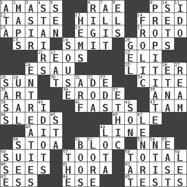 ACROSS 1. Collect or gather 6. Actress Charlotte 9. Air pressure measure (abbr.) 12. Clothes sense 13. Land elevation 14. Flintstone 15. Bee-related 16. Armor plate that protects the chest 17. Printing process, for short 18. Indian title of respect (Mr.) 19. Stricken, poetically 20. Republicans 21. Vintage cars 23. Connecticut Ivy Leaguer 24. Son of Isaac 25. 61 cubic inches 28. Player for Phoenix 30. Sadhe (variant) 34. Quote 35. Tate display 36. Wear away 38. Santa ___, CA 39. Indian skirt 41. Goes without food and/or water 43. Scottish cap 44. Bobsleighs 46. Hollow 48. Small island 49. Actor's bit 50. Portico 51. Coalition 53. Compass dir. 56. Set or collection 57. A blast of a horn 58. "_____ Recall" 60. Perceives with the eye 61. Israeli folk dance 62. Originate 63. Double-curved letter 64. Compass dir. 65. Trials DOWN 1. _ moment's notice (2 wds.) 2. Atlas contents 3. SW Saudi Arabia district 4. Flight of steps 5. Elected rep. 6. Swiss mountan, "Queen of the Mountains" 7. Came down and settled, as after flight 8. Raised railways 9. Conciliate 10. Puts into a specified state 11. Wedding promise 13. Is hesitant and indecisive 14. Play 19. Boozer 20. Set 22. Erode 24. Pleas 26. Inactive volcano in Sicily 27. 480, 500 or 516 sheets of paper 28. Backtalk 29. Mountain range 31. Sandy's bark 32. ___ good deed 33. Begley and Asner 37. Value system 40. Foolish or stupid persons 42. Manchild 45. R.R. building 47. Poe poem 49. Globular water bottle used in Asia 50. Institutes legal proceedings 51. Scornful sounds 52. Old wives' tales, e.g. 54. Nuclear Threat Initiatives 55. Compass direction 56. Compass dir. 57. Definite Article 58. Make lace 59. French article