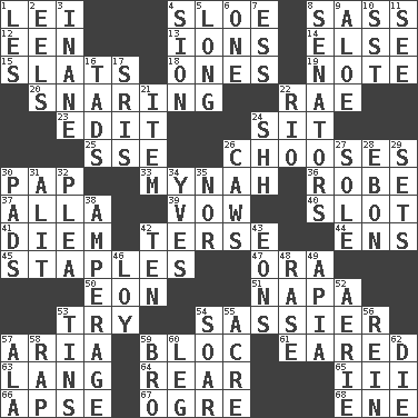 ACROSS 1. Luau accessory 4. _ gin 8. Backtalk 12. Car or cant ending 13. Charged particles 14. Otherwise 15. Narrow boards 18. Singles 19. Musical sound 20. Catching in a trap 22. Actress Charlotte 23. Prepare for publication 24. Be seated 25. Compass dir. 26. Elects 30. Infant food 33. Non-adult bird? 36. Loose flowing garment 37. Silent film actress Nazimova 39. Solemn pledge 40. Slit 41. South Vietnam president (1954) 42. Laconic 44. Followers of ems 45. Paper fasteners 47. Mouth or opening 50. Period of immesurable duration 51. California wine valley 53. Attempt 54. More disrespectful 57. Roberta Peters solo 59. Coalition 61. Having ears or earlike features 63. Long (Scottish) 64. Posterior 65. One more than two 66. Domed church section 67. Legendary monster 68. Compass dir. DOWN 1. French article 2. Snakelike fish 3. Silly 4. The Jewish people; Israel 5. Protracted 6. Single 7. Curvy letter 8. Legislators 9. _ vera 10. Fast jet (abbr.) 11. Observe 16. Bits 17. Indian titles of respect 21. A distinct part 22. River (Sp.) 24. Quiet! 26. Crow sounds 27. Not divided or shared with others 28. Inky black, to poets 29. Arranges properly for use 30. Groovy apts. 31. Came down and settled, as after flight 32. Entreaty 34. Jacques Cousteau's middle name 35. Not either 38. Electrical Measurement 42. "___ Little Indians" 43. Immeasurably long periods of time 46. Myrna of the movies 48. Raze (variant) 49. Capital of Western Samoa 52. Nest on high 53. Canisters 54. Fly high 55. Land measure 56. It's straight from the horse's mouth 57. Chicken ___ king 58. Reproach for some lapse or misdeed 59. Sis' sibling 60. Part of a journey 62. Expire