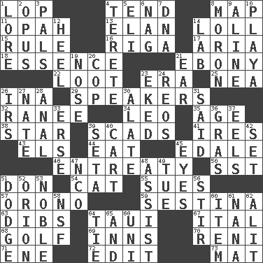 ACROSS 1. Chop off 4. Be inclined (to) 8. Atlas unit 11. Brightly colored fish 13. Style 14. Hang loosely or laxly 15. General guideline 16. Capital of Latvia 17. Operatic vocal solo 18. Center 21. Dark wood 22. Plunder 23. Epoch 25. Teachers' org. 26. _ tizzy (2 wds.) 29. Orators 32. The wife of a rajah (variant) 34. Lion 35. Grow older 38. Play the lead 39. Large numbers or amounts 41. Angers 43. Raised railways 44. Consume 45. Peak District village in England 46. Plea 50. Fast jet (abbr.) 51. Spanish title 54. Domesticated feline 55. Institutes legal proceedings 57. U. of Maine site 59. French poetic form 63. Rights 64. "Change" in Tahitian 67. Slanted text style (abbr.) 68. Eighteen holes 69. Restaurants 70. Painter Guido (1575-1642) 71. Compass dir. 72. Prepare for publication 73. Floor protector DOWN 1. Old wives' tales, e.g. 2. Musical composition 3. Friends 4. Cigar-shaped 5. Biblical high priest 6. Tired old horse 7. Heredity factor (abbr.) 8. Person of subnormal intelligence 9. Place in a line 10. Beach, in Buenos Aires 12. The bottom of a shoe or boot 14. Experiment locale 19. Sense of smell 20. Police officer (slang) 21. Hearing organ 23. Supplemented with great effort 24. Vintage cars 26. Big collection agency 27. Nathan's nickname 28. Of or related to the anus 30. Having winglike extensions 31. Expressed in words 33. Celtic language 36. Pate de foie ____ 37. Snakelike fish 39. Bristle 40. Heavy open wagon 42. Put into a specified state 45. Snake ____ (dice throw) 47. Non-commissioned officer (abbr.) 48. Help 49. Third day of the wk. 51. Evade 52. Greek mythologigal hunter 53. Impressive in appearance 56. Commotion 58. Science/research agcy. 60. Detail 61. Grandmother 62. Set down 64. Standoff 65. Also 66. Single; one (prefix)