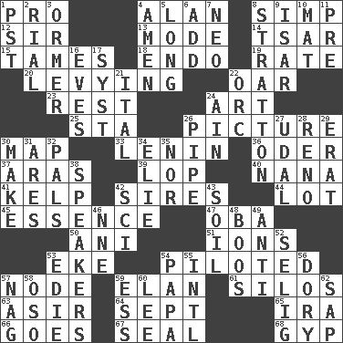 ACROSS 1. Adept person 4. Actor Alda or Thicke 8. Simple or foolish person 12. Title for a knight 13. Method 14. Russian ruler of old 15. Softens 18. Inside; within (prefix) 19. Assign a rank or rating to 20. Imposing or collecting, as a tax 22. Rowing implement 23. Remainder 24. Tate display 25. R.R. building 26. Photo 30. Atlas unit 33. Soviet premier 1918-24 36. River in Europe 37. Caspian sea tributary 39. Trim (branches) 40. Grandmother 41. Seaweed 42. Titles for men of rank and authority 44. Car dealer's back yard 45. Substance 47. Chief or king in Benin or Nigeria 50. Black tropical American cuckoo 51. Charged particles 53. Supplement with great effort 54. Manned the helm 57. Thickened enlargement 59. Enthusiasm 61. Grain storage towers 63. SW Saudi Arabia district 64. Back-to-school mo. 65. Lyricist Gershwin 66. Leaves 67. Lick closed 68. Con DOWN 1. Pacific Standard Time (abbr.) 2. Monetary unit of Yemen 3. Abalone 4. So be it 5. Yearn 6. Say or write further 7. Modern: prefix 8. Ski resort town in Vermont 9. Austrian river, tributary to the Danube 10. Floor covering 11. Before (prefix) 16. Nights before holidays 17. System (abbr.) 21. Slanted text style (abbr.) 22. The grampus (Milton) 24. The 18th letter of the Arabic alphabet 26. Corncob 27. Hereditary estate 28. Former U.S. Attorney General Janet 29. Part of Q.E.F. 30. Cause to be 31. Ancient Greek god of war 32. Friends 34. Writer Wiesel 35. And not 38. Orators 42. _-fi 43. Land 46. Compass dir. 48. Scornful sounds 49. Against 52. Major League Baseball Commissioner Bud 53. Singer Brickell 54. Dad 55. International (abbr.) 56. Dinghy 57. Tired old horse 58. Bear (Spanish) 59. Double-curved letter 60. Area sheltered from the wind 62. Plant excrement
