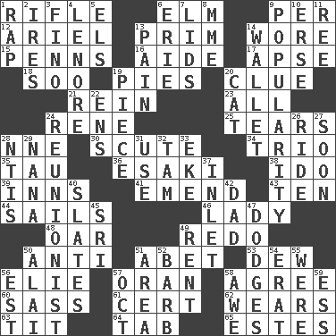 ACROSS 1. Firearm 6. Shade tree 9. For each 12. Satellite of Uranus 13. Demure 14. Had on 15. Actor Sean's family 16. Helper 17. Domed church section 18. "Barney Miller" actor Jack 19. Sliced desserts 20. A slight indication 21. It's straight from the horse's mouth 23. 100% 24. French philosopher Descartes 25. Pulls into pieces 28. Compass dir. 30. Scutum 34. Musical group of three 35. The 19th letter of the Greek alphabet 36. 1973 Nobel Price Winner (Physics) Leo 38. Wedding promise 39. Taverns 41. Make improvements or corrections to 43. Nine, plus one 44. Moves on water 46. Kenny Rogers chart-topper in '80 48. Rowing implement 49. Do over again 50. Against 51. Collude with 53. Morning condensation 56. Writer Wiesel 57. Northwest Algerian city 58. Match 60. Backtalk 61. Foregone conclusion 62. Erodes 63. Teat (slang) 64. Keyboard key 65. _____ Park, CO DOWN 1. Reproach for some lapse or misdeed 2. Angers 3. A pale, very dry sherry 4. Poe poem 5. Raised railways 6. 4th largest of the Great Lakes 7. Hats (slang) 8. Madame (abbr.) 9. Teen's desire 10. Celtic language 11. Portuguese money of account (variant) 13. Ache 14. Place for singles 19. Part 20. Domesticated feline 22. Followers of ems 24. One who advocates reunion 26. Travel on an animal 27. Within a short period 28. Nuclear Threat Initiatives 29. Grandmother 31. Purpose 32. Scottish cap 33. Make supply last 37. An arm off of a larger body of water 40. Chalkboards 42. Male parent 45. _ Lanka 47. Evades 49. Monthly bill 50. Jai ____ 51. Length times width 52. Sharp remark 54. Part of Q.E.F. 55. Past tense of be (plural) 56. Eastern Standard Time (abbr.) 57. Sep. follower 58. Deep reverence 59. Curvy letter