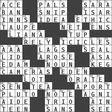 ACROSS 1. Adept person 4. Friends 8. "Two Mules for Sister ____" 12. Prohibit 13. Sever or remove by pinching or nipping 14. Austrian river, tributary to the Danube 15. Lodging establishments 17. It may be bright or harebrained 18. Moral principle 19. Grayish beige 21. Fish or hair follower 23. Followers of ems 24. Woody, climbing, usually tropical plant 26. Uncastrated adult male sheep 28. Have confidence or faith in 30. Winter's stalactites 34. Auto club (abbr.) 37. Fails to keep up a pace 39. Lick closed 40. Hat (slang) 41. Came up 43. White ___ sheet 44. Dutch treat 46. Part of speech 47. Barrel 48. Devices for capturing images 51. Genesis locale 54. Car dealer's back yard 55. Speak pompously 58. Elected rep. 61. Beverage made from leaves 63. To the left, to Queeg 65. Greek god of the underworld 67. Observe 71. Hindu god of fire 72. Helper 73. Musical group of three 74. The 18th letter of the Arabic alphabet 75. Adolescent 76. Without 77. Perceive with the eye DOWN 1. "This won't hurt ____!" 2. Lessep's creation 3. World-weariness 4. 23rd letter of the Greek alphabet 5. Added to 6. Whopper 7. Connect, as a bridge 8. Be seated 9. American tennis player Robert 10. Precipitation 11. Arches 16. Practice fight 18. Needle holder 20. Compass dir. 22. And so on (abbr.) 25. Silent film actress Nazimova 27. Personal Computers (abbr.) 29. Tall tales 30. Come out of 31. Path through which fluid escapes 32. Comfort 33. Volcanic refuse 34. Actor Baldwin 35. Opera by Verdi 36. First of billions? 38. Thick or sticky substance 42. Inside; within (prefix) 45. Cartoonist voice _ Blanc 49. Printing process, for short 50. Had dinner 52. Epoch 53. California wine valley 56. Ancient Roman robes 57. Bert's buddy 58. Argument over a trivial matter 59. Writer Wiesel 60. Unadorned 62. Pismires 64. Prong on a fork 66. Nine, plus one 68. Mouth or opening 69. Shallow baking pan 70. Greek goddess of the dawn