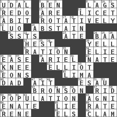 ACROSS 1. Hereditary estate 5. Benjamin's nick name 8. Straggles 12. Redecorate 13. "We ___ not amused" (Victoria) 14. It is permitted: Lat. 15. "This won't hurt ____!" 16. Happening in regular succession 19. Nilotic language 20. Refrain by choice 21. Fast planes 23. Had dinner 24. Sound made by sheep 27. Behest 30. Shout 31. Food allowance for one day 34. Writer Wiesel 35. Comfort 38. Satellite of Uranus 40. Nathan's nickname 41. Leg joint 42. American author Paul (1891-1958) 44. Immeasurably long periods of time 45. Pale green bean 46. Male parent 47. Small island 50. Son of Isaac 53. "Death Wish" actor 57. To free from 59. Census information 63. Hindu god of fire 64. Related on the mother's side 65. Untruth 66. Assign a rank or rating to 67. French philosopher Descartes 68. Raised railways 69. Dollar (slang) DOWN 1. Mountain range 2. Alight from a bus 3. Goodbye (Sp.) 4. Car dealer's back yard 5. Sharp remark 6. Greek god of love 7. Remaining after all deductions 8. 54 in ancient Rome 9. Adept person 10. Set 11. Filthy place 14. Actor's bit 17. Auto club (abbr.) 18. Teat (slang) 20. Toward the sea 22. Triads 24. Actor Lugosi 25. Came down and settled, as after flight 26. Toward shelter 28. R.R. building 29. Hoop that covers a wheel 30. Gossips 32. Petroleum 33. 1994 drama film starring Jodie Foster 35. Made supply last 36. Small Philippine buffalo 37. Post 39. Cards in a Roman deck? 43. Sign of something about to happen 47. Competent 48. Retirement account (abbr.) 49. Small child 51. Therefore, facetiously 52. National forest in Provo, Utah 54. The longest river in the world 55. Earth 56. Washington bills 58. South Vietnam president (1954) 59. For each 60. Single 61. Baking dish 62. Shoshoni 63. Curve