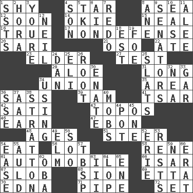 ACROSS 1. Like a shrinking violet 4. Play the lead 8. At sea 12. Within a short period 14. Migrant worker of the '30s 15. Actress Patricia 16. Loyal 17. Unrelated to defense, as in spending 20. Indian skirt 21. Bear (Spanish) 22. Had dinner 23. A person who is older than you are 27. Trial 29. _ vera 31. Yearn 34. The state of being joined or united 35. Length times width 36. Backtalk 39. Scottish cap 41. Russian ruler of old 42. Suttee (variant) 43. Traditional theme or motif 46. Merit 47. Inky black, to poets 48. Eras 51. Navigate 54. Ingest 56. Car dealer's back yard 58. French philosopher Descartes 61. Form of transportation 66. Austrian river, tributary to the Danube 67. Oscar Madison type 68. The Jewish people; Israel 69. Singer James 70. Pulitzer Prize-winning author Ferber 71. Corncob 72. Arrange properly for use DOWN 1. Fast planes 2. Israeli folk dance 3. You are 4. Male child 5. Ring climax 6. The 18th letter of the Arabic alphabet 7. Redecorate 8. One (Scot) 9. Legislators 10. Compass direction 11. Toward shelter 13. Famous astronaut Armstrong 18. Eastern Standard Time (abbr.) 19. Enemy 24. One of the 12 tribes of Israel 25. Connecticut Ivy Leaguer 26. Carrot, for example 28. Narrow boards 30. Related on the mother's side 32. Teachers' org. 33. Slender fish 34. Putting into practice 36. Compass dir. 37. Auto club (abbr.) 38. Ski resort town in Vermont 40. Crowds into 44. Cooking vessel 45. Single 49. Shade tree 50. "Barney Miller" actor Jack 52. One of the Great Lakes 53. Musical pauses 54. Relaxation 55. Old (Scot.) 57. Cook's measure (abbr.) 59. Nathan's nickname 60. Part of Q.E.F. 62. Chief or king in Benin or Nigeria 63. One more than two 64. Chop off 65. Compass dir.