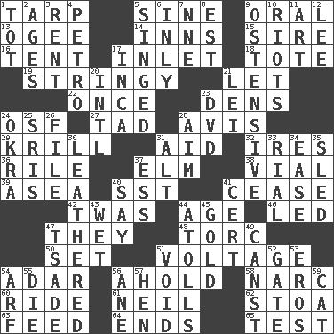 ACROSS 1. Canvas cover 5. Trig term 9. Of the mouth 13. Double curve, resembling the letter S 14. Taverns 15. Beget 16. Portable shelter 17. An arm off of a larger body of water 18. Carry 19. Slender, wiry 21. Allow 22. At one time in the past 23. Cub Scout units 24. Order of Saint Francis (abbr.) 27. Bit 28. Deliberation 29. Shrimp-like planktonic crustaceans 31. Assist 32. Angers 36. Cause heat under the collar 37. Shade tree 38. Small bottle 39. Toward the sea 40. Fast jet (abbr.) 41. Stop 42. It was, poetically 44. Mature 46. Directed 47. Those things 48. Torque (variant) 50. Arrange properly for use 51. Electrical Measurement 54. The sixth month of the Jewish calendar 56. Hold, grip (Informal) 58. Drug cop 60. Travel on an animal 61. Famous astronaut Armstrong 62. Portico 63. Nourish 64. Extremities 65. Trial DOWN 1. Small child 2. Eras 3. Monthly bill 4. Stone: prefix 5. Scorched 6. Inwardly 7. Compass dir. 8. Eastern Standard Time (abbr.) 9. Clearly or manifestly demonstrative 10. Debaucheries 11. Tate display 12. Area sheltered from the wind 17. South American Indian 20. International (abbr.) 21. Luau accessory 23. Movie disc 24. Gumbo ingredient 25. Indian titles of respect 26. Do some clerical work 28. Direct toward a target or goal 30. Resembling or made to resemble leather 31. The first octave above the treble staff 33. Monetary unit of Yemen 34. Comfort 35. Downhill vehicle 37. Curvy letter 40. Declare 41. Sure thing 43. Dripping 44. Ringlike coral islands and reefs 45. Aureate 47. Sadhe (variant) 49. 2nd pers. sing. pres. of can (arch.) 51. Empty area or space 52. Yard entry 53. Greek god of love 54. Sandy's bark 55. Expire 56. One (Scot) 57. Layer 59. Feline