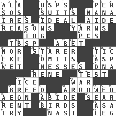 ACROSS 1. According to 4. United States Postal Service (abbr.) 8. For each 11. Mayday 12. Sets or collections 14. Grandmother 15. Angers 17. Perfect 18. Assistant 19. Thinks logically 21. Entertaining tales 23. Coat; cloak 24. Personal Computers (abbr.) 25. Cook's measure (abbr.) 27. Collude with 30. Or not 31. A viewer who gazes fixedly 34. Nervous spasm 37. Supplement with great effort 38. Leaves out 39. Viper 40. Soggy 41. Makes clutter 43. Heredity factor (abbr.) 44. French philosopher Descartes 45. Trial 47. Frozen water 49. Armed conflict 50. A special lineage 52. Moved like an arrow 56. Age 57. Stay 60. Scorch 61. Monthly bill 62. Avian creatures 63. White ___ sheet 64. Attempt 65. Political cartoonist Thomas 66. Part of a journey DOWN 1. SW Saudi Arabia district 2. Old wives' tales, e.g. 3. Toward the sea 4. Exploiting 5. Beer foam 6. Sliced dessert 7. R.R. building 8. Aches 9. Extremities 10. Actress Charlotte 13. Wily 14. Drug cop 16. Fast planes 20. I made a mistake 22. Fitting 25. Puff or smoke 26. Cy Young winner Saberhagen 27. Originate 28. Antes 29. Celtic language 30. ___ Haven, CT 32. Heavy book 33. So be it 34. Small amounts or degrees 35. Is not 36. Tax preparer (abbr.) 42. Play the lead 44. To separate or throw off 46. Greek god of love 47. Literary sarcasm 48. Penny 49. Obtain by seizing forcibly or violently 50. Fermented drink made from hops 51. Apply (a substance) by light strokes 52. Sums up 53. Welt 54. Comfort 55. To trail on the ground 56. Tate display 58. Storage container 59. Lyricist Gershwin