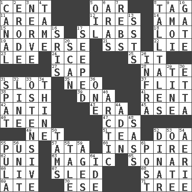 ACROSS 1. Penny 5. Rowing implement 8. Label 11. Length times width 12. Angers 14. Housemaid (var.) 15. Typical models 17. Broad, flat, thick pieces 18. Car dealer's back yard 19. Contrary to your interests or welfare 21. Fast jet (abbr.) 22. Whopper 23. Area sheltered from the wind 24. Frozen water 25. Be seated 27. Plant excrement 28. Nathan's nickname 31. Narrow opening 35. Modern: prefix 37. Sudden quick movement 38. Expression of disdain 39. Heredity factor (abbr.) 41. Monthly bill 42. Opposed to 43. Period 45. Toward the sea 46. Adolescent 47. Music discs 49. Fish or hair follower 51. Beverage made from leaves 52. ___ good deed 55. Ichor 57. _ moment's notice (2 wds.) 60. Stimulate to action 62. Single; one (prefix) 63. Mysterious quality of enchantment 65. Underwater navigation system 66. 54 in ancient Rome 67. Downhill vehicle 68. Suttee (variant) 69. Had dinner 70. Compass dir. 71. Family _ (genealogy) DOWN 1. Lessep's creation 2. Wear away 3. Boldness 4. Not wild 5. Lubricate 6. Ancient river in northeast Turkey 7. Confederate soldiers (slang) 8. Baron Munchausen's specialties 9. Mine, in Marseilles 10. Yard entry 13. Fast planes 16. Indian titles of respect 17. Oozed 20. Examine minutely or intensely 26. Kind of red light 29. Prong on a fork 30. Singer James 31. Argument over a trivial matter 32. Actor's bit 33. Clearly or manifestly demonstrative 34. One or ones belonging to thee 36. Single 40. Northern region 44. An important port of Yemen 48. Backtalk 50. Scottish caps 52. Middle Eastern gold or silver currency 53. Declaim 54. Nest on high 55. Monetary unit of Botswana 56. A single undivided whole 58. Falsehood 59. Eons 61. Mail 64. Binary compound