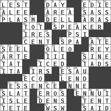 ACROSS 1. For fear that 5. 24 hours 8. Singer Brickell 12. Toward shelter 13. Type of rug 15. Backtalk 16. Suffix with ecto or cyto 18. Small valley 19. Caspian sea tributary 20. Small child 22. Orator 24. Angers 26. Air pressure measure (abbr.) 27. Penny 28. Health resort 29. Had dinner 32. Stitch closed the eyes of (a falcon) 35. Butter sub 37. Marina Del _, California 38. Johnson of "Laugh-In" 39. One more than two 40. Trig term 41. Make lace 42. On the rocks 43. Small boys 44. Call ___ day 45. Big collection agency 46. He sold his birthright 49. Environmental prefix 50. Grant temporary use of 51. Substance 55. Compass dir. 56. Narrow board 57. Greek god of love 59. World-weariness 63. Capri or Wight 64. Habitations of wild animals 65. Portable shelter 66. False hair 67. Compass dir. 68. Expressed in words DOWN 1. Infant locale 2. Pipe bend 3. Ocean 4. One of the two male reproductive glands 5. June honoree 6. Ancient Greek god of war 7. Sharp bark 8. 1973 Nobel Price Winner (Physics) Leo 9. Have the gumption 10. Austrian river, tributary to the Danube 11. Double-curved letter 14. City in Syria 17. Greater amount 21. "___ Little Indians" 23. White ___ sheet 25. Unemotional ones 28. Beer mug 29. Roberta Peters solo 30. Be inclined (to) 31. Snake ____ (dice throw) 32. Suttee (variant) 33. Part of Q.E.F. 34. Singer James 36. Falsehood 40. SAT takers 42. Pressed 45. Frozen water 47. Elected rep. 48. Singer Murray 49. First name in cosmetics 51. Otherwise 52. Table seasoning 53. Group working together 54. Immeasurably long periods of time 56. Be seated 58. Compass dir. 60. Teachers' org. 61. Single; one (prefix) 62. It would