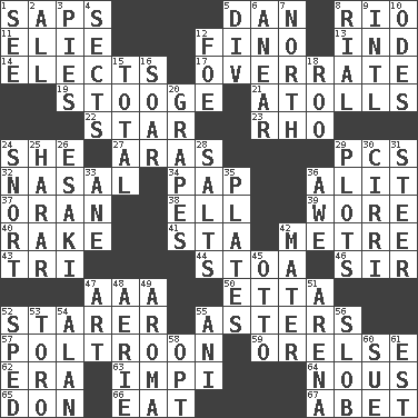 ACROSS 1. Plant excrements 5. One of the 12 tribes of Israel 8. _ de Janeiro 11. Writer Wiesel 12. Fine (Spanish) 13. Indiana (abbr.) 14. Opts 17. Make much ado about nothing 19. Moe Howard, for one 21. Ringlike coral islands and reefs 22. Play the lead 23. 17th letter of the Greek alphabet 24. A female animal or person 27. Caspian sea tributary 29. Personal Computers (abbr.) 32. Rhinal 34. Infant food 36. Set down 37. NW Algerian seaport 38. Pipe bend 39. Had on 40. Immoral or dissolute person 41. R.R. building 42. Distance measurement (Brit.) 43. Three (prefix) 44. Portico 46. Title for a knight 47. Auto club (abbr.) 50. Singer James 52. A viewer who gazes fixedly 55. Michaelmas daisies 57. Coward 59. Threatening words 62. Epoch 63. Body of Kaffir warriors 64. Common sense 65. Spanish title 66. Consume 67. Collude with DOWN 1. Perceive with the eye 2. Everything 3. Sliced desserts 4. Religious groups 5. HTML Container Element 6. Approach 7. 0 degrees 8. Monetary unit of Yemen 9. International (abbr.) 10. Lyric poems 12. Enemy 15. "_____ Recall" 16. Fly high 18. Friend of Pooh 20. Wine fruits 24. Derisive sound 25. Ethiopian city, capital of Harari 26. 1973 Nobel Price Winner (Physics) Leo 28. Table seasonings 29. Schemes 30. High-altitude cloud 31. Guide 33. A saturated hydrocarbon 35. Food holders 36. Deep reverence 42. Mother 45. Von Bismarck 47. Tate display 48. Nest on high 49. Odor 51. Sports stadium 52. Hurried 53. "Corrida" creature 54. Actor Alda or Thicke 55. Cuckoo 56. Oscar Madison type 58. Choose 60. Institute legal proceedings 61. Eastern Standard Time (abbr.)