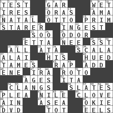 ACROSS 1. Trial 5. Slender fish 8. Soggy 11. Angers 12. Mouths or openings 14. Nursemaid (var.) 15. Brizilian seaport 17. "Beetle Bailey" pooch 18. Demure 19. A viewer who gazes fixedly 21. Consume 23. "Barney Miller" actor Jack 25. Aroma 26. Singer James 27. Born 28. Fast jet (abbr.) 31. Everything 33. "One Day ___ Time" 35. Any of the three canals of the cochlea 37. Jai ____ 38. Part of HMS, perhaps 40. Took on color 41. Softens 43. Strike 45. Increase 46. Compass dir. 47. Retirement account (abbr.) 50. Printing process, for short 52. Matures 53. Call ___ day 54. Gives out a loud, resonant sound 56. Chalkboards 61. Entreaty 62. Mediterranean tributary 65. Garlic unit 66. The 18th letter of the Arabic alphabet 67. At sea 68. Migrant worker of the '30s 69. Movie disc 70. Small child 71. Snakelike fish DOWN 1. Canisters 2. Part of Q.E.F. 3. Bristle 4. Russian ruler of old 5. Thick or sticky substance 6. Tate display 7. Food allowance for one day 8. Armed conflicts 9. Send forth 10. Scottish cap 13. Something which is sent 16. For fear that 18. For each 20. Round or rotation of duties 22. Moves 24. Pledge 26. Writer Wiesel 28. Saudi Arabian king (1953-1964) 29. Downhill vehicle 30. Small boy 31. Actor Alda or Thicke 32. Unable to walk 34. Atmosphere 36. US Secretary of Labor Elaine L. _ 37. Had dinner 39. Indian skirt 42. Signal 44. Plant holders 48. Canadian anthropologist Darnell 49. Aid 51. Baby powder 52. Auto club (abbr.) 54. 154 in Roman numerals 55. Grant temporary use of 57. Medicinal plant 58. Casino tip 59. Morally bad or wrong 60. Perceives with the eye 61. Writing tablet 63. Lion 64. Consume