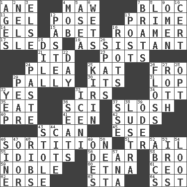 ACROSS 1. One (Scot) 4. Informal term for the mouth 7. Coalition 11. Set 12. Airs 13. A-one 14. Raised railways 15. Collude with 16. Nomad 17. Bobsleighs 19. Helper 21. It would 23. Cooking vessels 24. Entreaty 25. Krazy ___ of comics 26. Back 29. Chummy 30. It is 31. Chop off 32. Consenting reply 33. Big collection agency 34. Baseball player Mel 35. Erode 36. _-fi 37. Splash clumsily 40. Before (prefix) 41. Car or cant ending 42. Soap bubbles 43. Glance over 45. Compass dir. 46. Drawing lots 51. Hang back 55. Foolish or stupid persons 56. Letter starter 58. Sis' sibling 59. Impressive in appearance 60. Inactive volcano in Sicily 61. Corporate head (abbr.) 62. Celtic language 63. R.R. building 64. Fast jet (abbr.) DOWN 1. Matures 2. 1994 drama film starring Jodie Foster 3. Otherwise 4. Crowd into 5. Toward the sea 6. Soaks 7. Naughty children 8. Pale green bean 9. Sign of something about to happen 10. Certainty 12. Soft color 13. Mail 16. Debaucheries 18. Deli pickle 20. Arguments over trivial matters 22. 24 hours 24. Thick mixture 25. Japanese brewing company 26. Soft thread for cleaning between teeth 27. Writer of Portnoy's Complaint (1969) 28. Elect 29. Lightbulb-shaped fruit 32. Slangy assent 33. Ancient Celtic tribe of eastern Britain 36. Theater features 37. Compass dir. 38. A period of five years 39. River in Europe 43. Took without asking 44. Quote 46. Trig term 47. Aroma 48. Teases 49. Lyric poems 50. Remaining after all deductions 52. Lettered men learn these first 53. Angers 54. Plunder 57. Santa ___, CA
