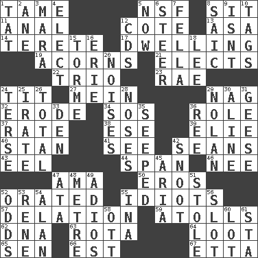 ACROSS 1. Not wild 5. Overdraft (abbr.) 8. Be seated 11. Of or related to the anus 12. ____ d'Azur (French Riviera) 13. White ___ sheet 14. Cylindrical with tapered ends 17. Home 19. Oak nuts 21. Chooses 22. Musical group of three 23. Actress Charlotte 24. Teat (slang) 27. Count _ (2 wds.) 29. Tired old horse 32. Eat (away) 34. Mayday 36. Hero or heavy, e.g. 37. Assign a rank or rating to 38. Compass dir. 39. Writer Wiesel 40. Comedian Laurel of Laurel & Hardy 41. Observe 42. Seines 43. Snakelike fish 44. Connect, as a bridge 46. Born 47. Nursemaid (var.) 50. Greek god of love 52. Declaimed 55. Foolish or stupid persons 57. Conveyance 59. Ringlike coral islands and reefs 62. Heredity factor (abbr.) 63. Roll call or roster of names 64. Plunder 65. Elected rep. 66. Eastern Standard Time (abbr.) 67. Singer James DOWN 1. Make lace 2. A saturated hydrocarbon 3. Hindu Mythology: god of death 4. Voters do this 5. At this time 6. Bull 7. Chap (slang) 8. Ketch in the Levant 9. Is not 10. Labels 12. Music discs 15. Singer Mel 16. One of the Great Lakes 18. Area sheltered from the wind 20. Annoying sounds 24. Laconic 25. Feeling or showing extreme anger 26. "_____ Recall" 28. Olfactory organs 29. Pitcher Ryan 30. Place in a line 31. Honkers 33. Lair 35. Oozed 36. Portuguese money of account (variant) 42. Snout, nose 45. Roberta Peters solo 47. "One Day ___ Time" 48. Distance measurement (Brit.) 49. Goodbye (Sp.) 51. Took without asking 52. Probability 53. French philosopher Descartes 54. ____ Jay Lerner 55. _ tizzy (2 wds.) 56. Position in a hierarchy or organization 58. Baseball player Mel 60. Car dealer's back yard 61. R.R. building